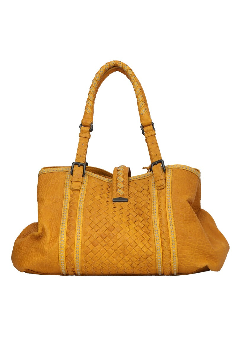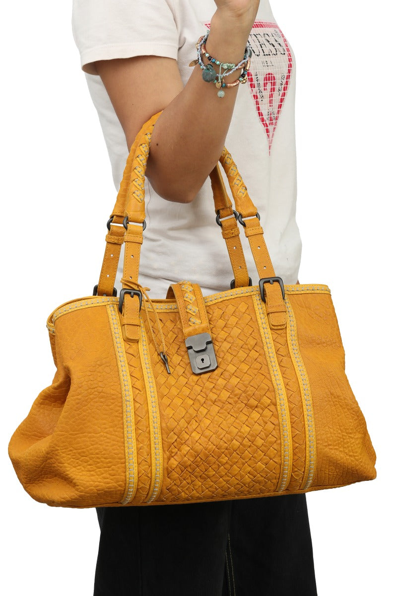 Bottega Veneta Yellow Leather Roma Intrecciato Tote Bag comes in this Stunning Yellow color. It falls under our PRISTINE Condition Category. No visible wear and tear or fading can be seen.