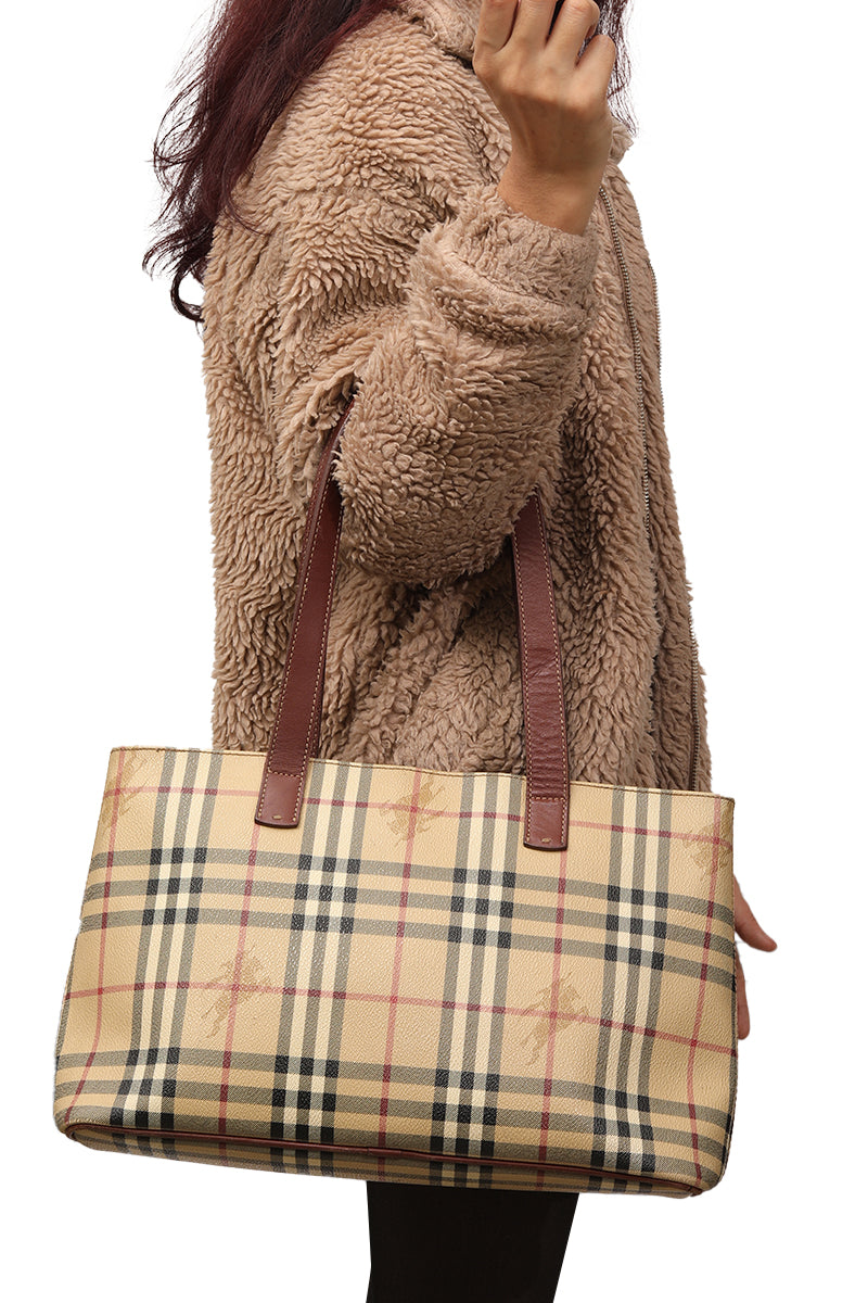 BURBERRY HAYMARKET RECTANGULAR CHECK TOTEcomes in this Stunning Beige color .It falls under our Like New Condition Category. No visible wear and tear or fading can be seen