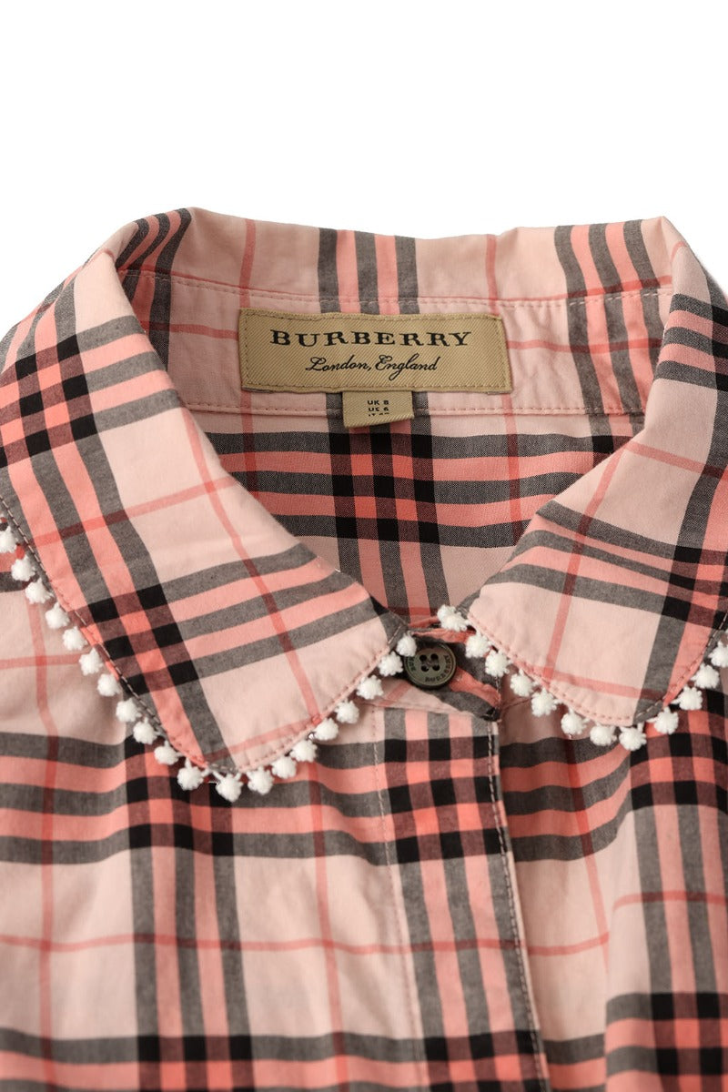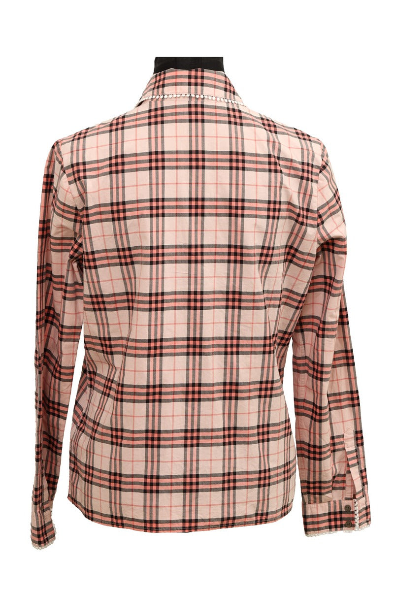 BURBERRY SIZE- UK 8/S PLAID PRINT LONG SLEEVE BUTTON-UP TOP comes in this Stunning Peach color. It falls under our Pristine Condition Category. No visible wear and tear or fading can be seen.