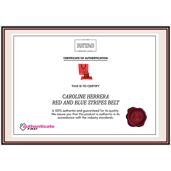 CAROLINE HERRERA RED AND BLUE STRIPES BELTComes in this stunning Red color. It falls under our Brand New Condition Category. No visible wear and tear or fading can be seen.
