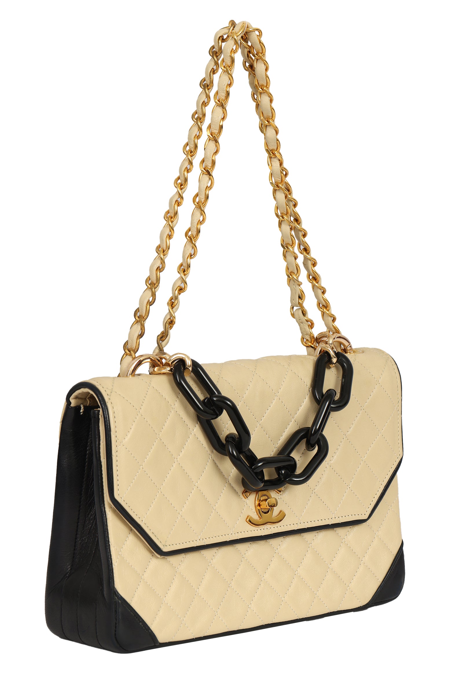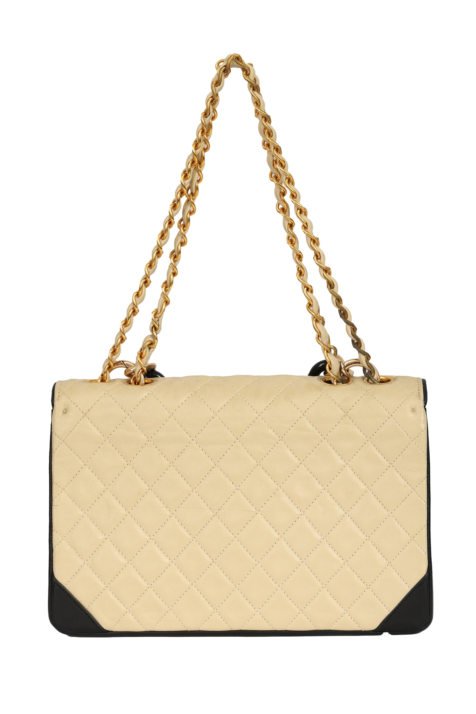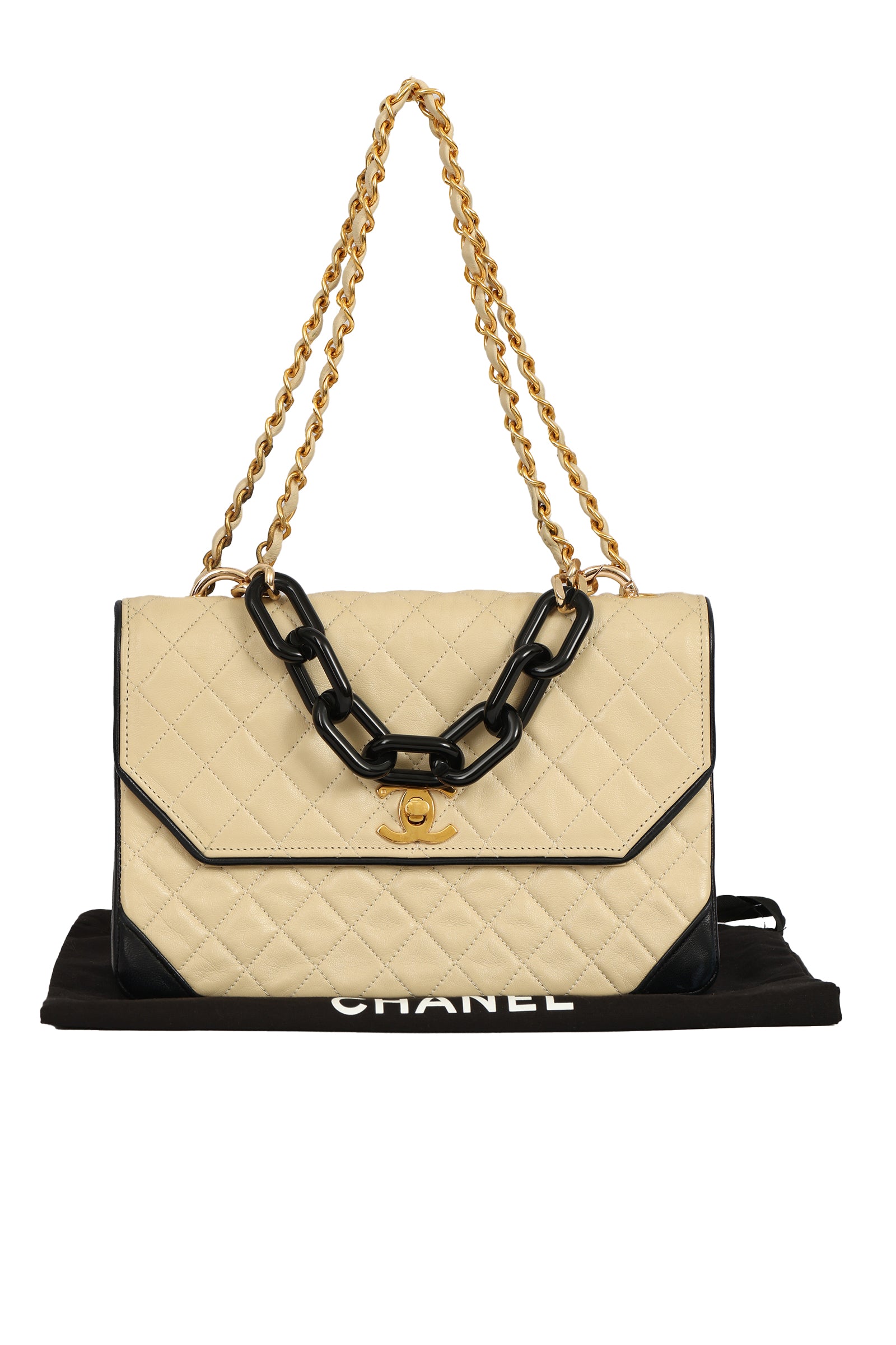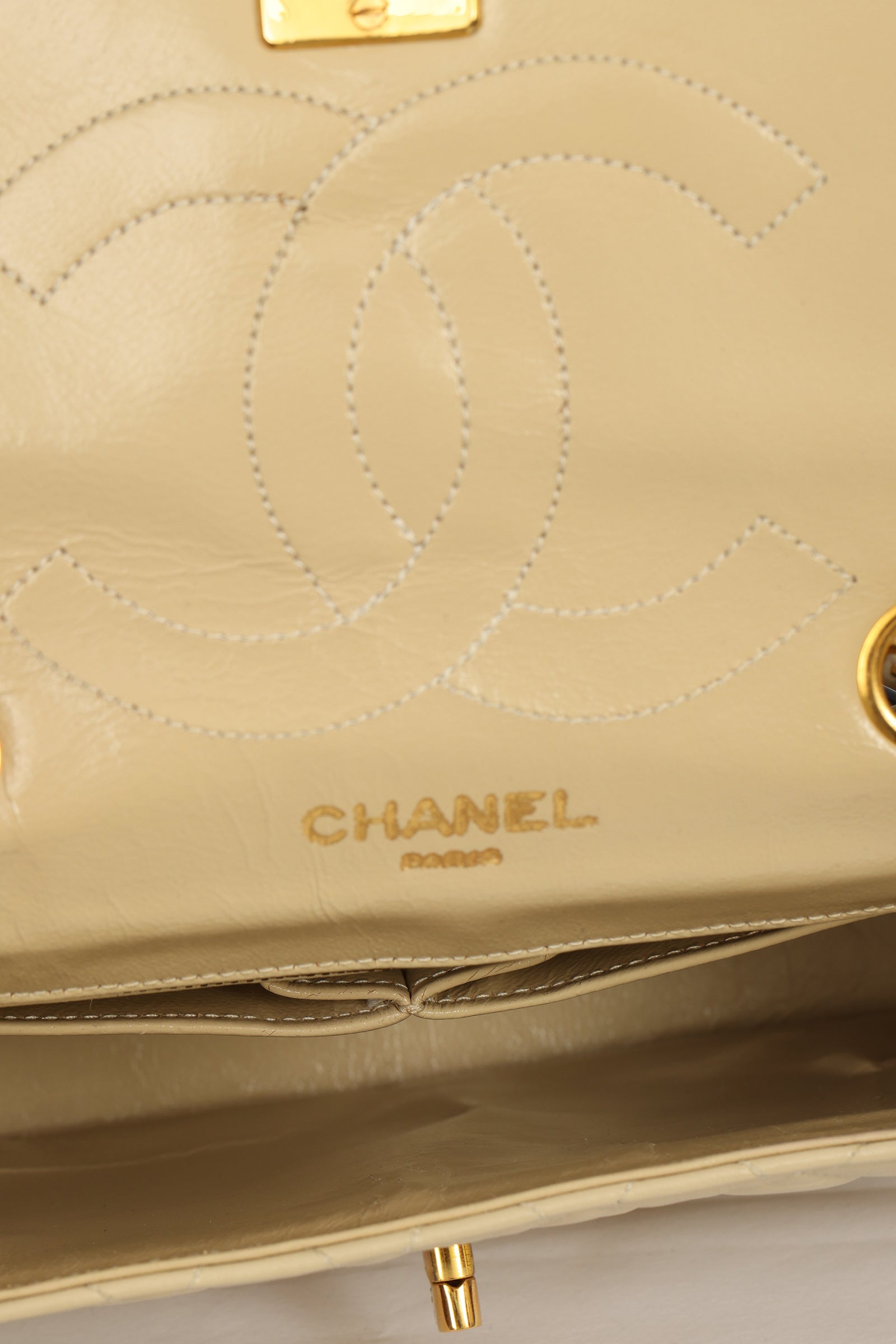 The Chanel Timeless Square Leather Flap Bag comes in a stunning beige color.