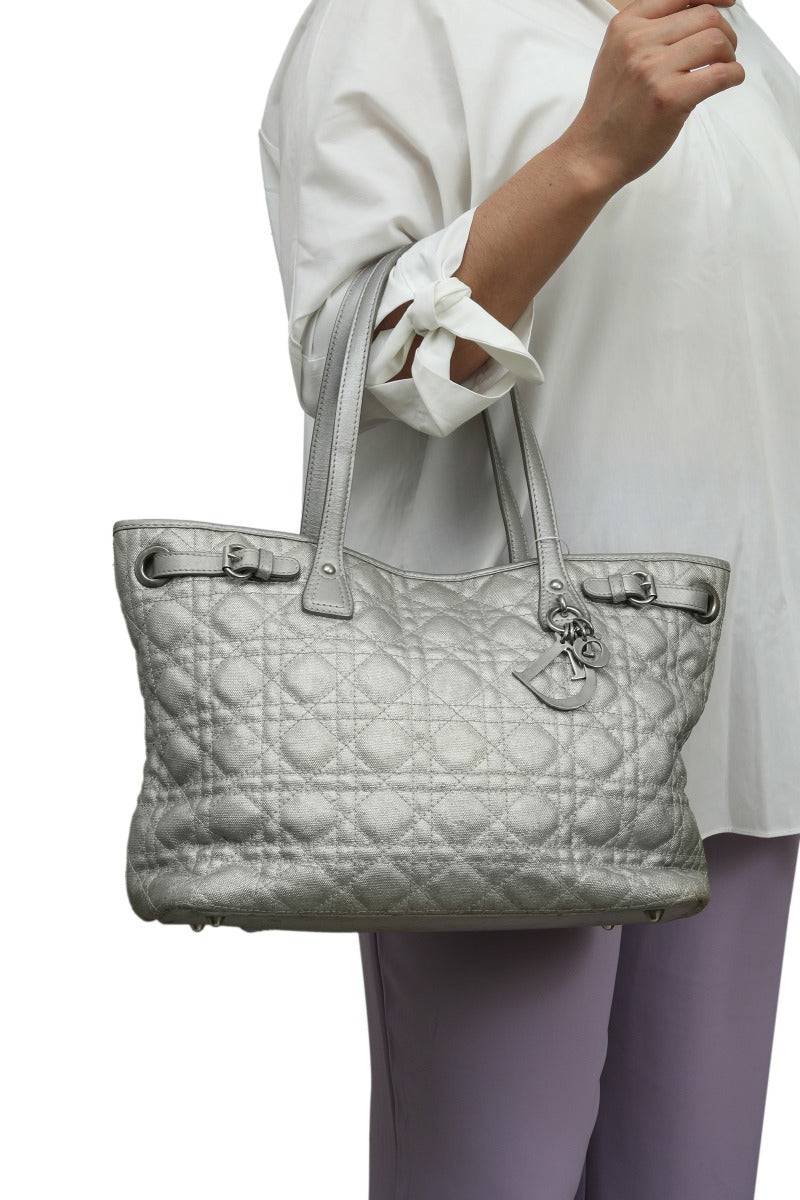 Christian Dior Cannage Coated Canvas Panarea Tote Bagcomes in this Stunning Silvercolor .It falls under our Pristine Condition Category. No visible wear and tear or fading can be seen