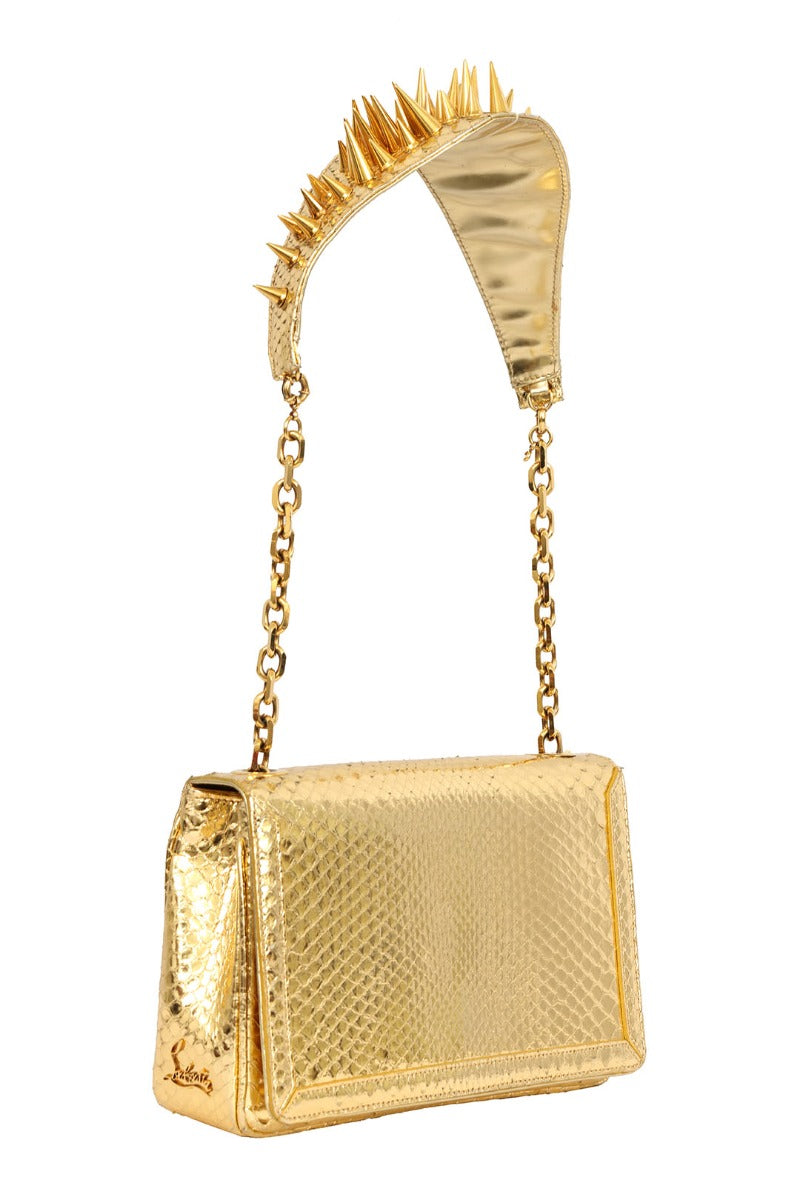 CHRISTIAN LOUBOUTIN GOLD PYTHON ARTEMIS SPIKED SHOULDER BAG comes in this Stunning Goldcolor .It falls under our Pristine Condition Category. No visible wear and tear or fading can be seen.
