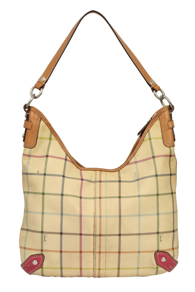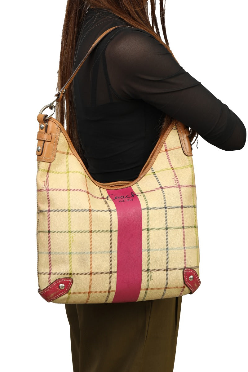 COACH HERITAGE BLUE STRIPE TATTERSALL PLAID HOBO BAG comes in this Stunning Beige color .It falls under our Pristine Condition Category. No visible wear and tear or fading can be seen.