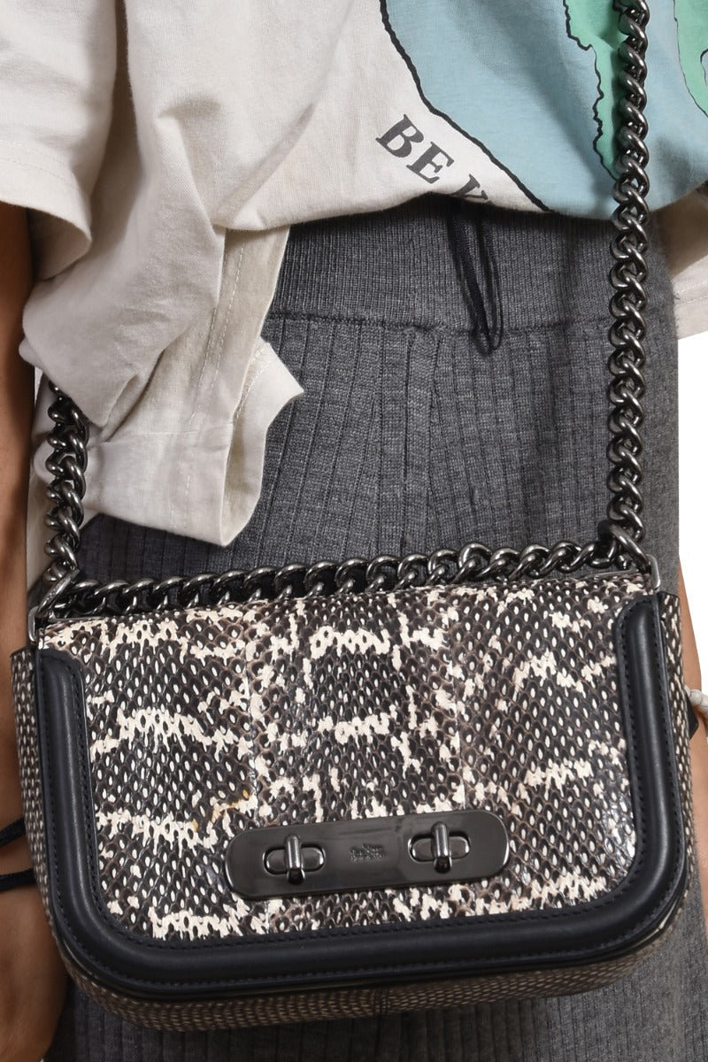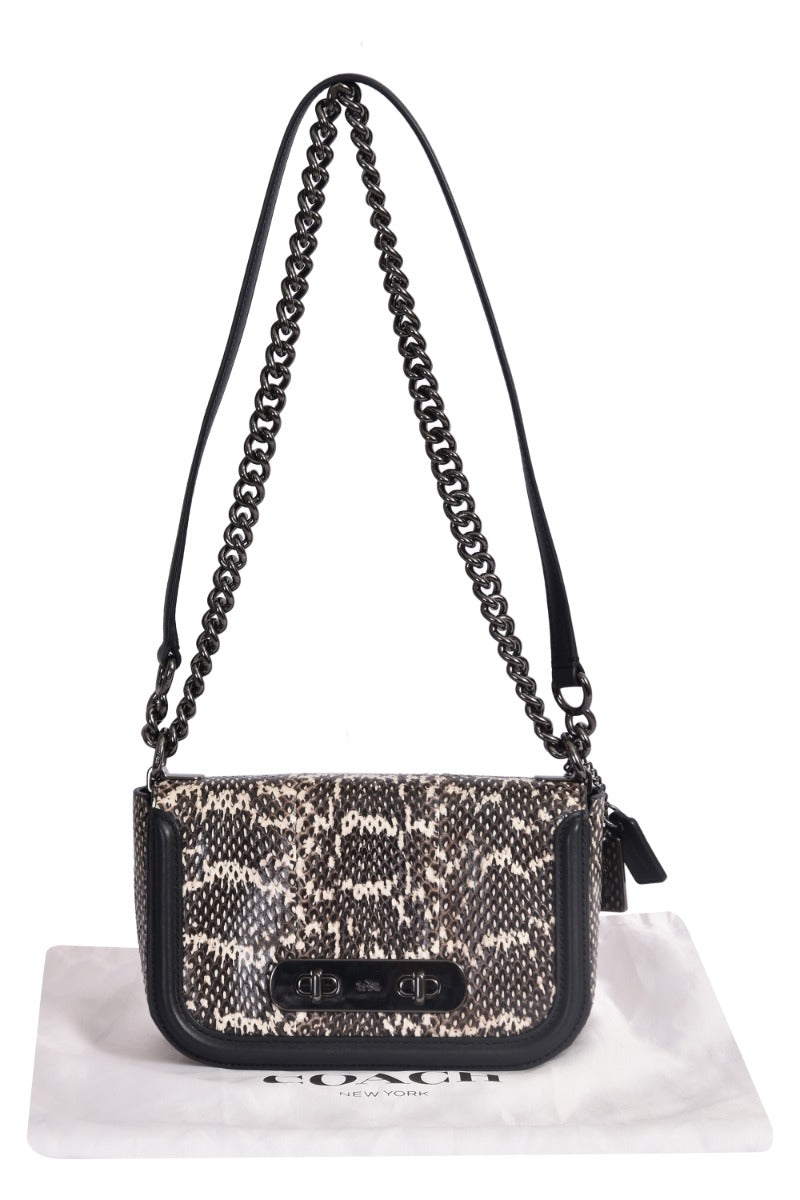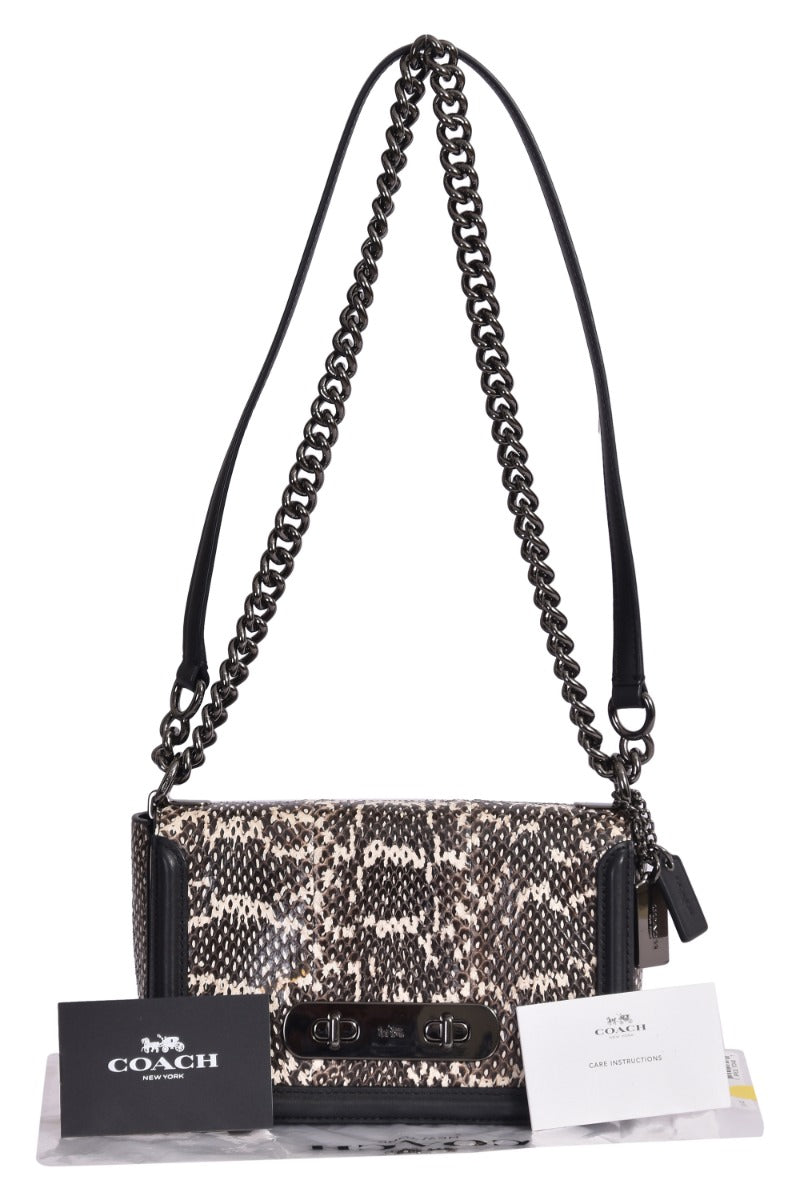Coach Leather Snakeskin Swagger 20 Turnlock Chalk Blach Shoulder Bag comes in this Stunning Blackcolor .It falls under our Never Been Used Condition Category. No visible wear and tear or fading can be seen