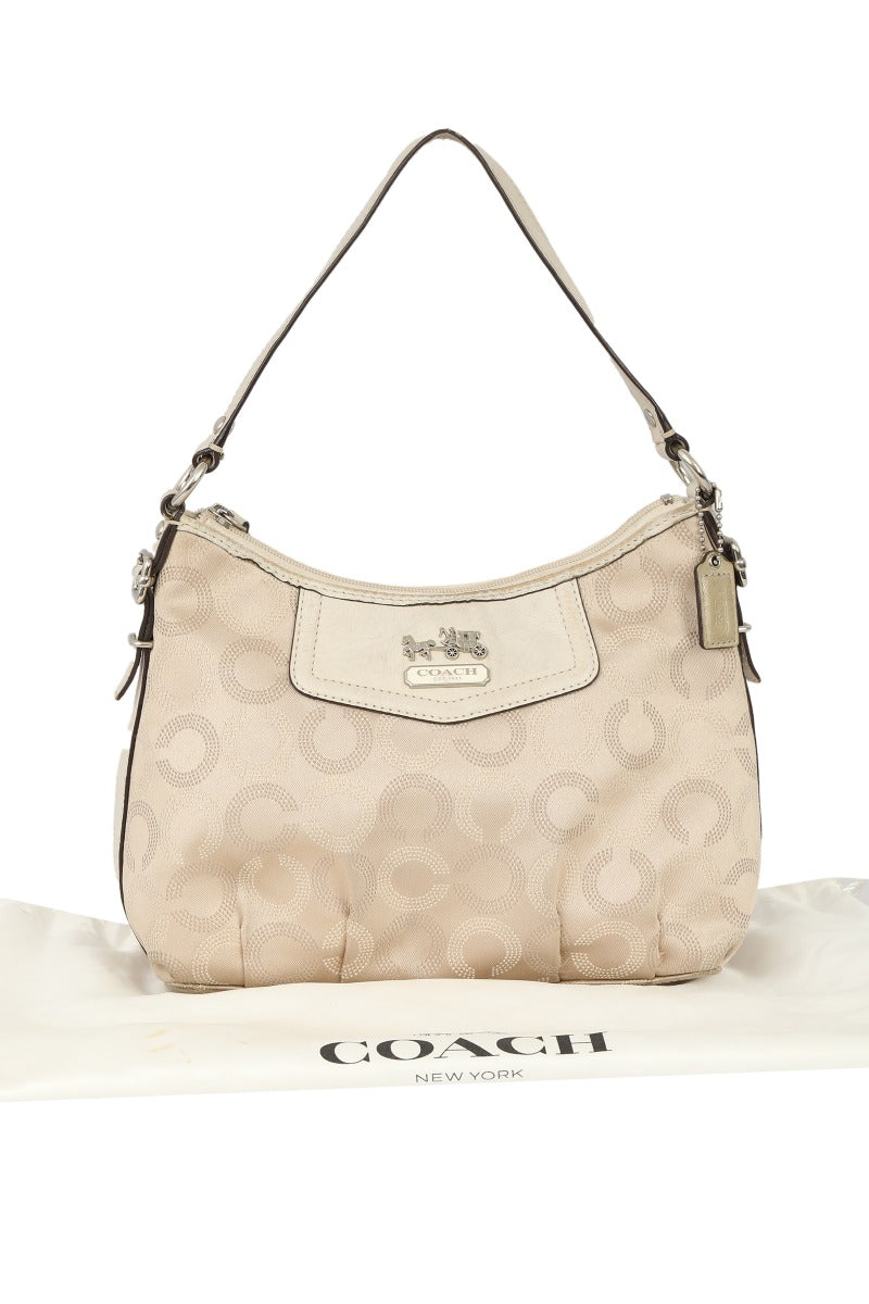 COACH MADISON DOTTED OP ART TOP HANDLE BAG comes in this Stunning Beige color .It falls under our pristine Condition Category. No visible wear and tear or fading can be seen.