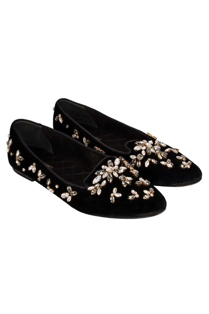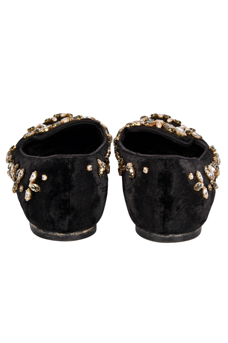 DOLCE AND GABBANA VELVET EMBELLISHED LOAFERS comes in this stunning Black color. It falls under our Pristine Condition Category. No visible wear and tear or fading can be seen