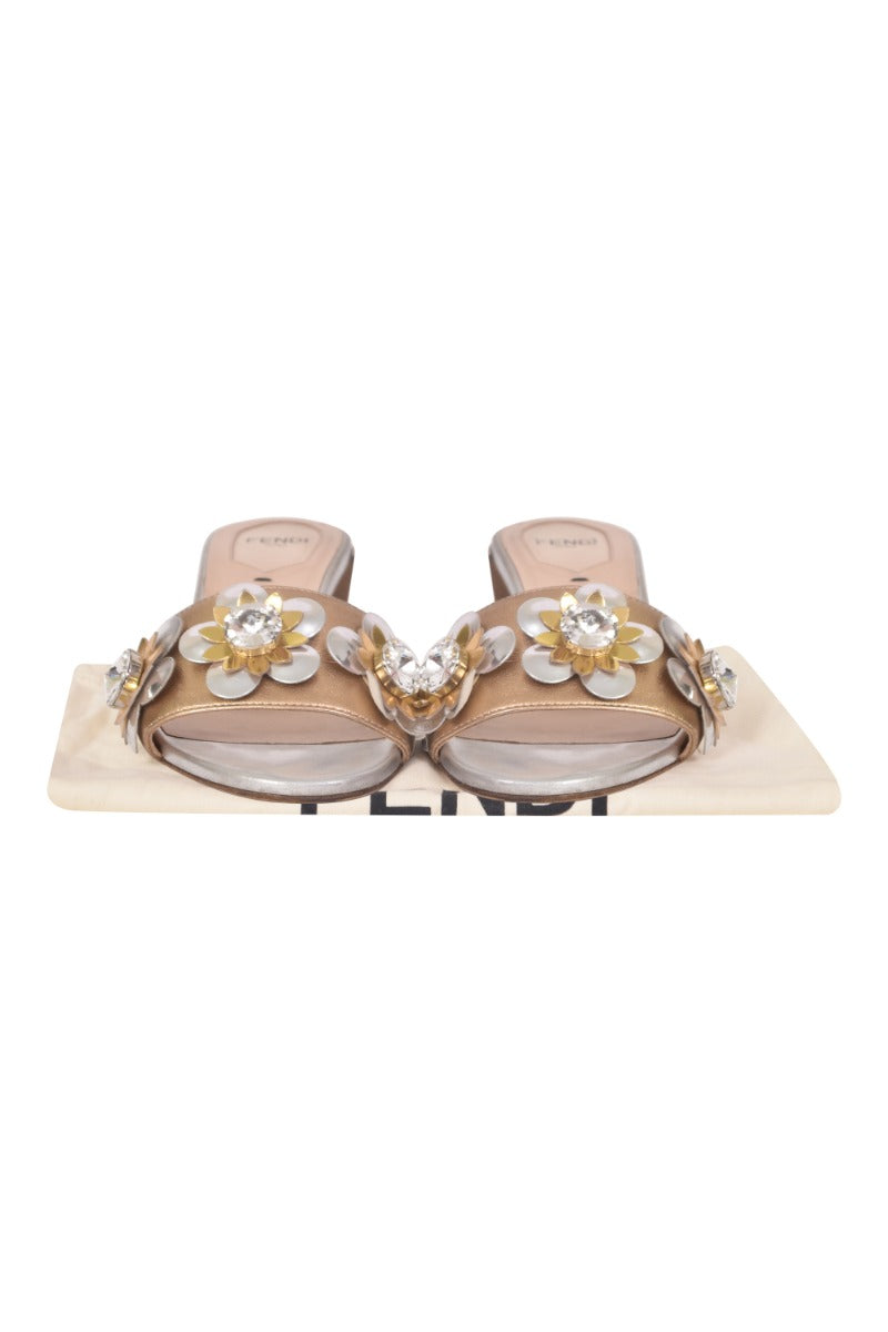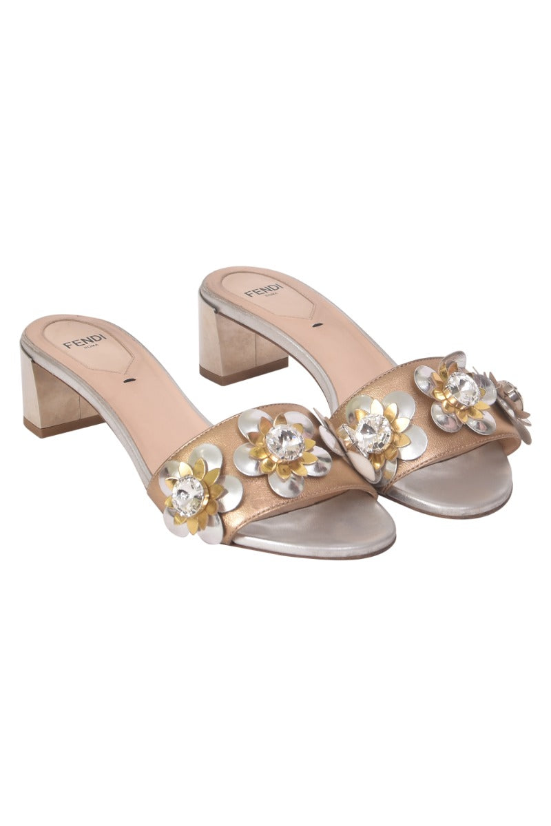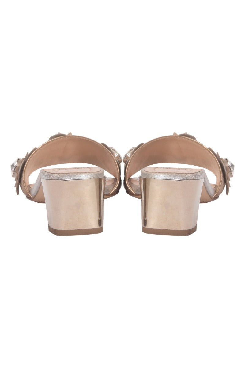 Fendi Flowerland Jeweled Metallic Heels comes in this stunning golden color. It falls under our Pristine Condition Category. No visible wear and tear or fading can be seen