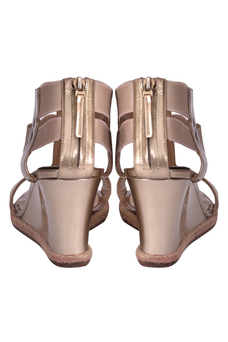 Fendi Patent Leather T Strap Wedges comes in this stunning Golden color. It falls under our Pristine Condition Category. No visible wear and tear or fading can be seen