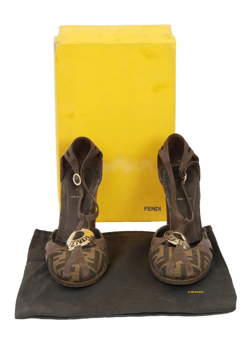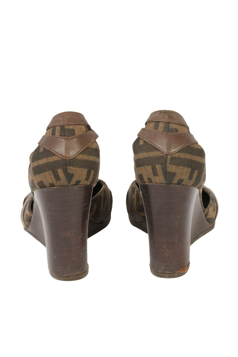 FENDI SIZE 39.5 ZUCCA CANVAS AND LEATHER WEDGE SANDALS comes in this stunning Brown color. It falls under our Pristine Condition Category.