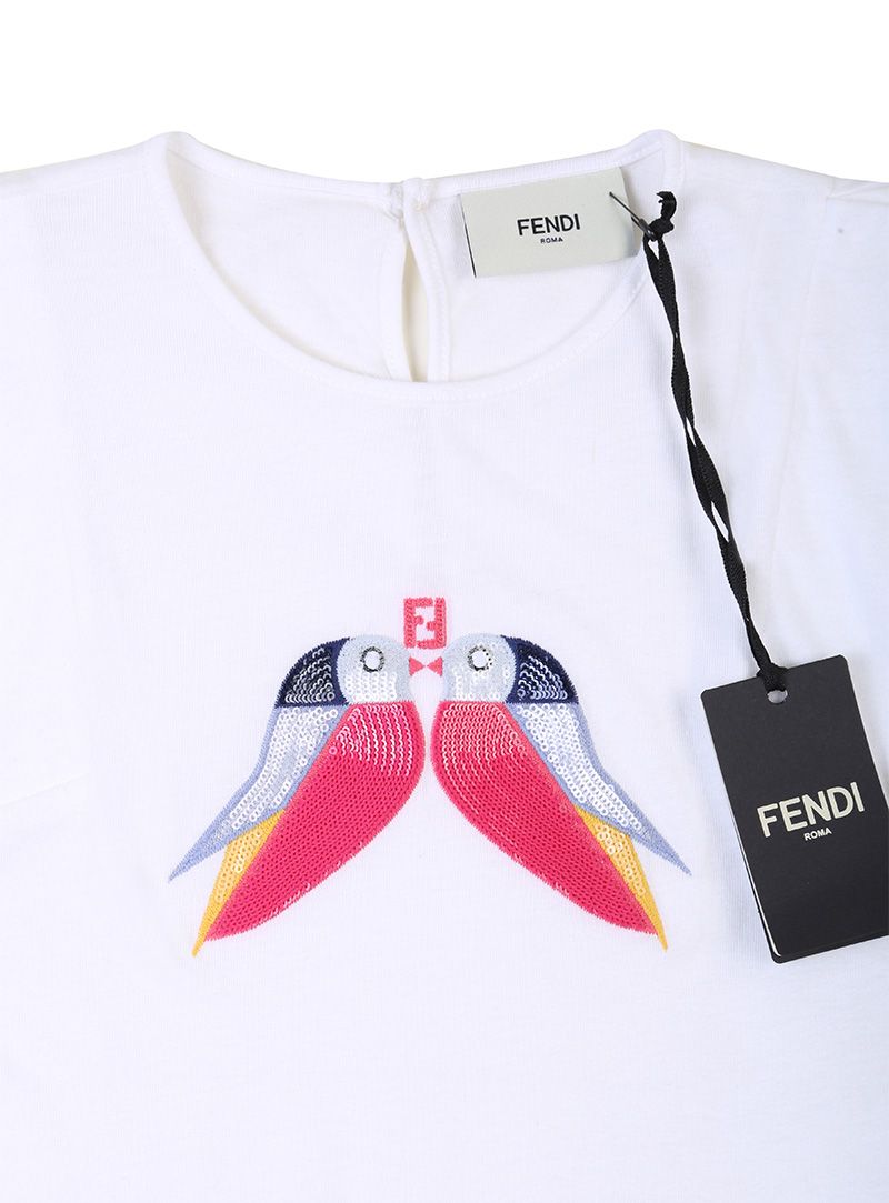 This white embroidered patchwork T shirt from Fendi has a soft - touch &is a conceptual choice for days out with friends and family. There is aregular fit and round collar with a very distinctive patchwork with colourful Birds in sequins and Fendi logo in red.Pair with the matching denims and trainers from the edit.