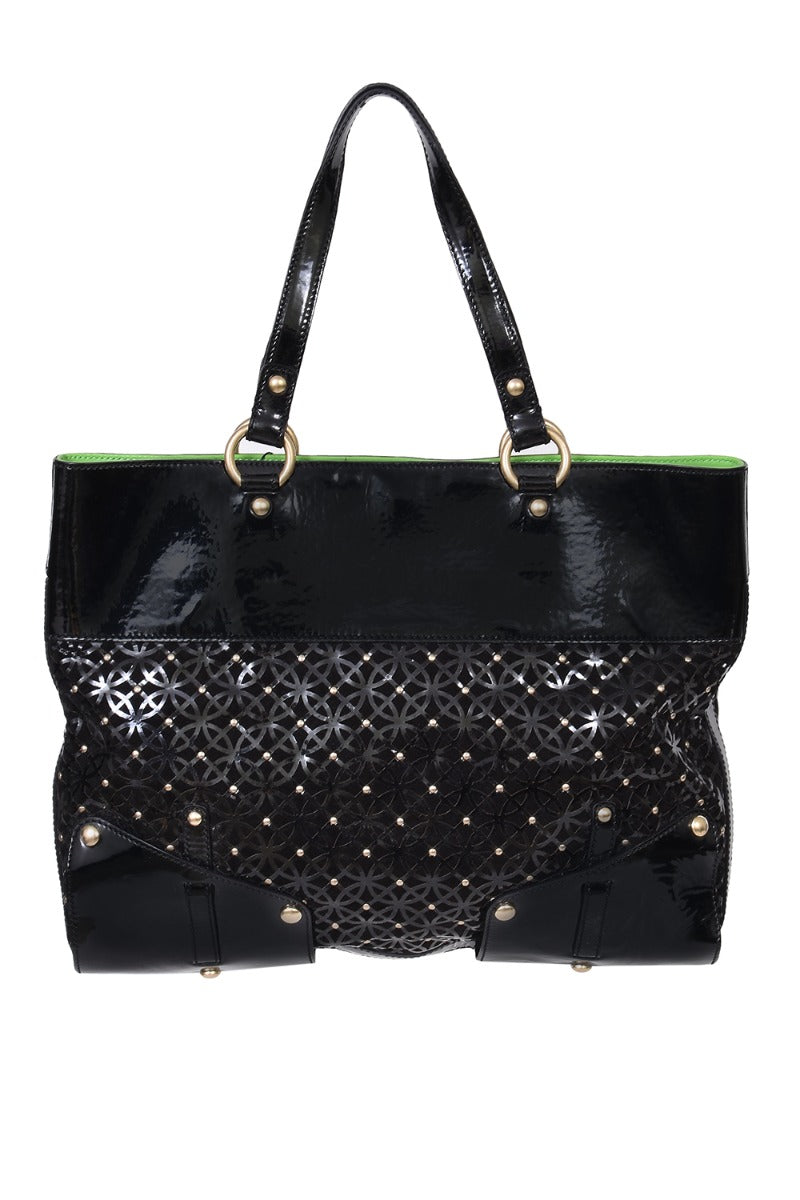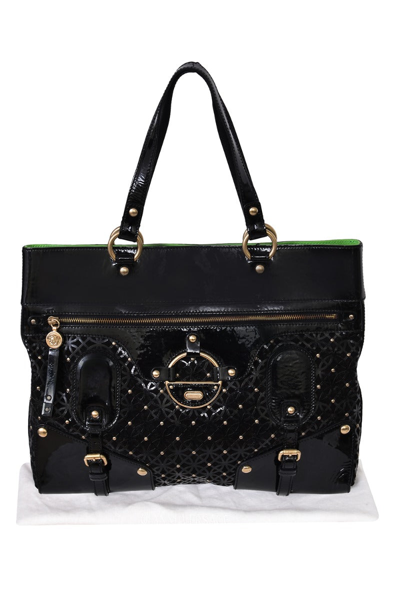 Gianni Versace Lasercut Patent Leather and Suede StuddedHandbag comes in this Stunning Black color .It falls under our Pristine Condition Category. No visible wear and tear or fading can be seen