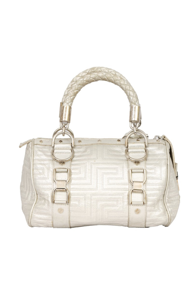 GIANNI VERSACE METALLIC SNAP OUT OF IT BOSTON BAG comes in this Stunning Silver color .It falls under our Good Condition Category.