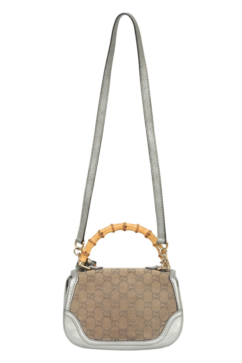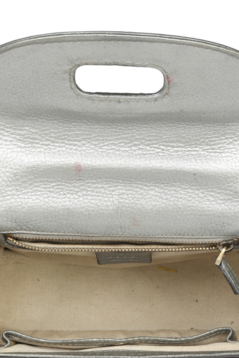 Gucci Bamboo Monogram Silver and Beige Top Handle Bag comes in this Stunning Beige/Silver color .It falls under our PRISTINE Condition Category. No visible wear and tear or fading can be seen.