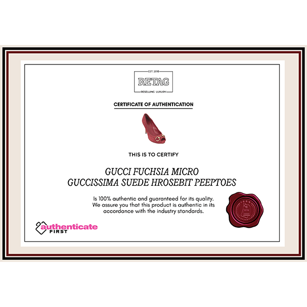 GUCCI FUCHSIA MICRO GUCCISSIMA SUEDE HROSEBIT PEEPTOES comes in this stunning Maroon color. It falls under our Pristine Condition Category. No visible wear and tear or fading can be seen