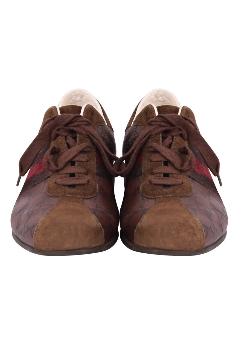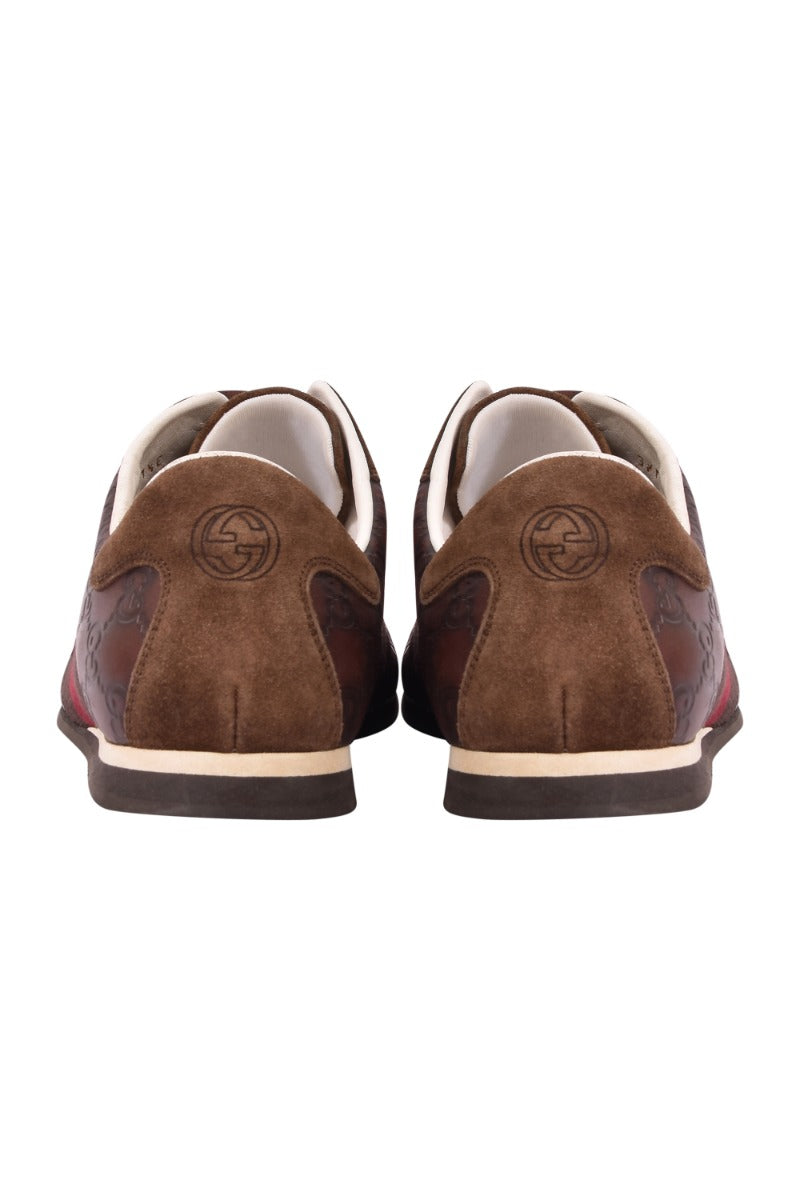 Gucci GG Web Monogram Leather Sneakerscomes in this stunning Brown color. It falls under our Pristine Condition Category. No visible wear and tear or fading can be seen