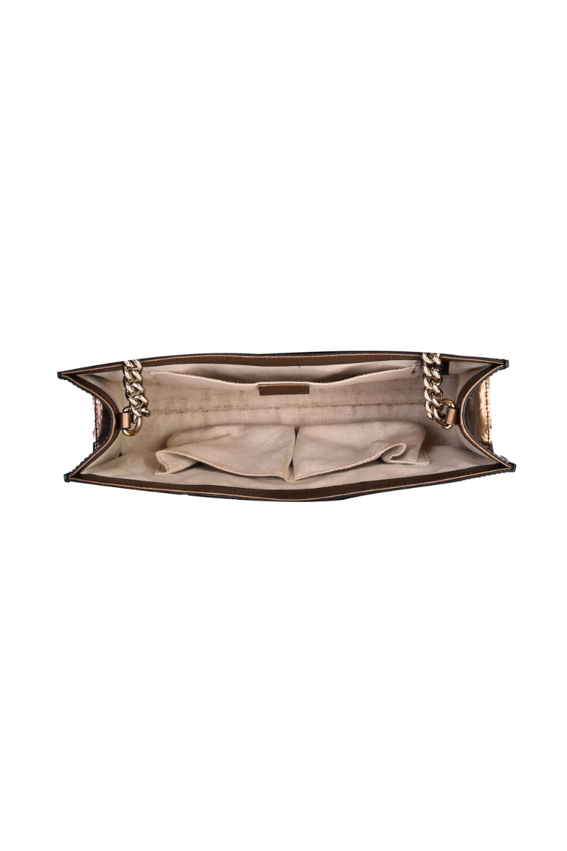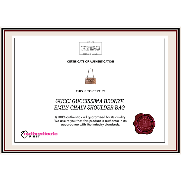 GUCCI GUCCISSIMA BRONZE EMILY CHAIN SHOULDER BAG comes in this Stunning Bronze color .It falls under our Pristine Condition Category. No visible wear and tear or fading can be seen.