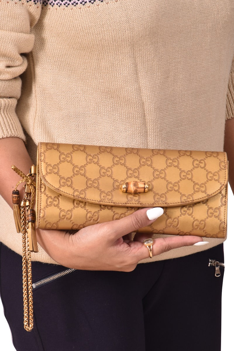 Gucci Limited Edition Guccissima Bamboo Clutchcomes in this Stunning Goldencolor .It falls under our Pristine Condition Category. No visible wear and tear or fading can be seen