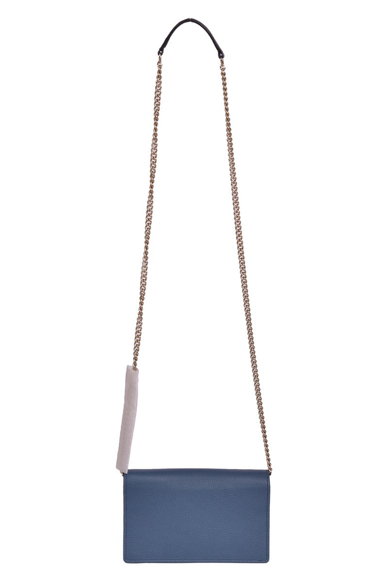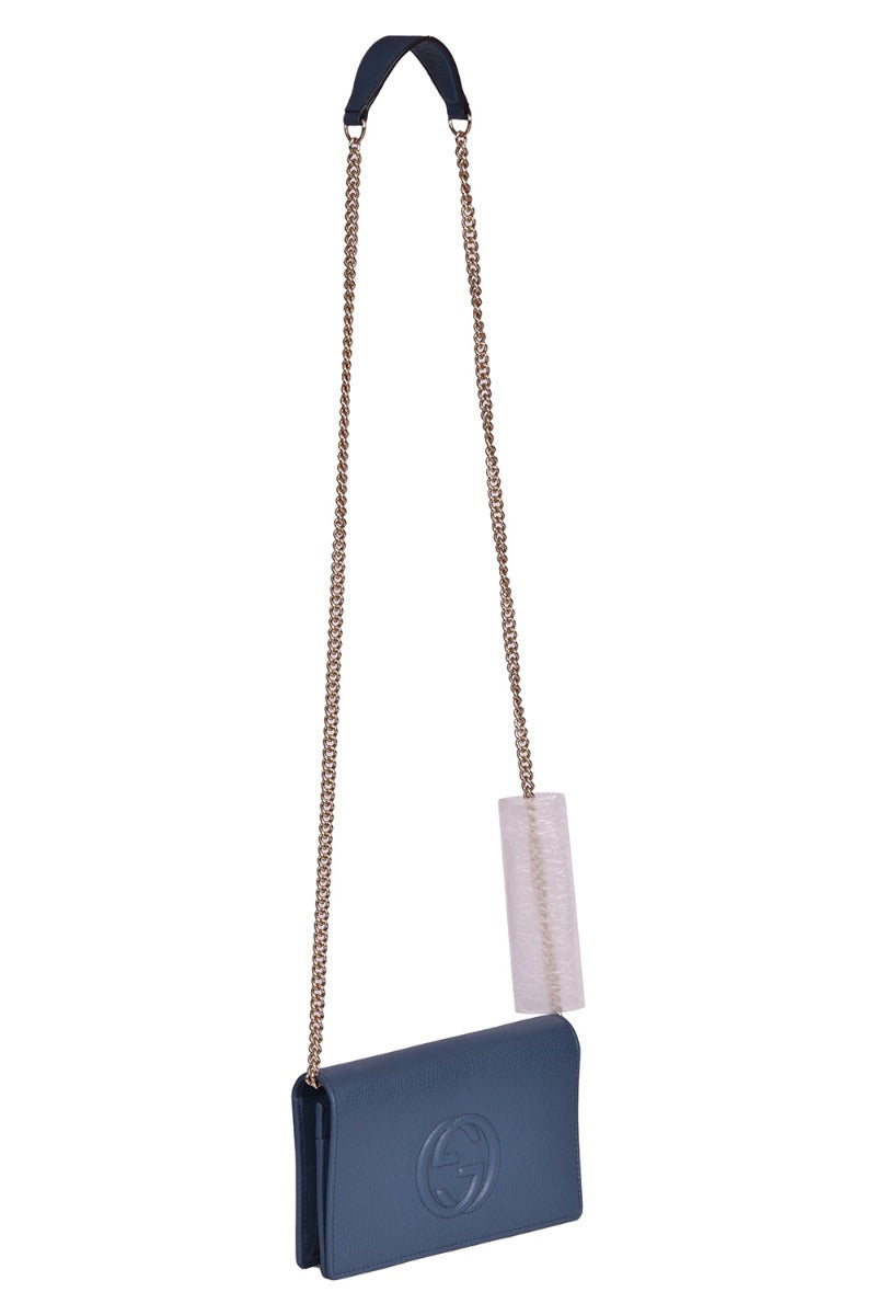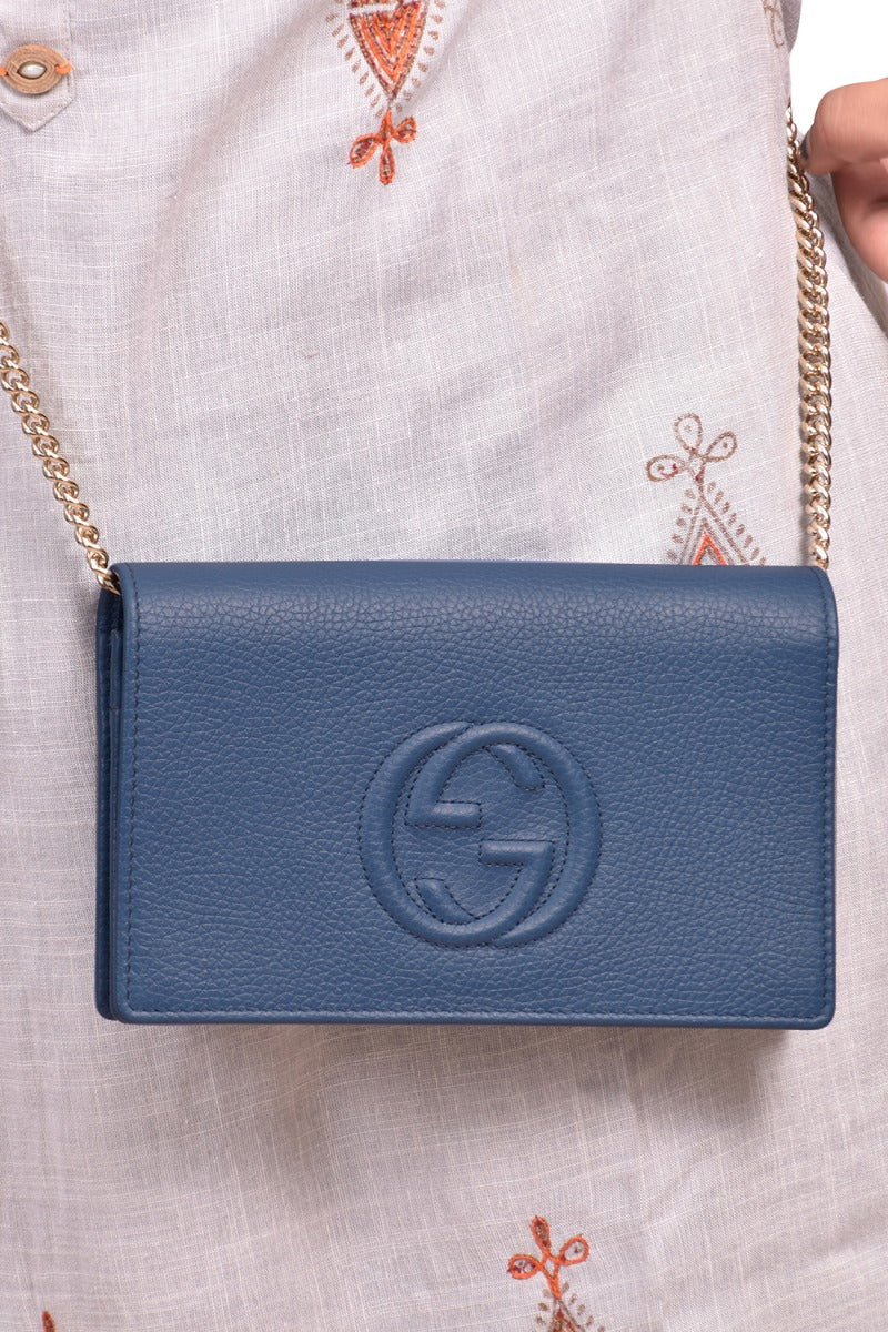 Gucci Mini Soho Pebbled Leather Wallet On Chaincomes in this Stunning Blue color .It falls under our New Without Tags Condition Category. No visible wear and tear or fading can be seen.