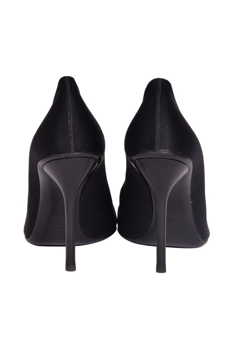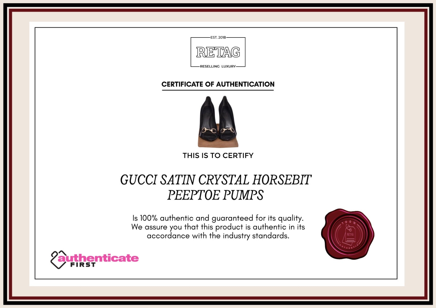 Gucci Satin Crystal HorsebitPeeptoe Pumps comes in this stunning Black color. It falls under our Pristine Condition Category. No visible wear and tear or fading can be seen.