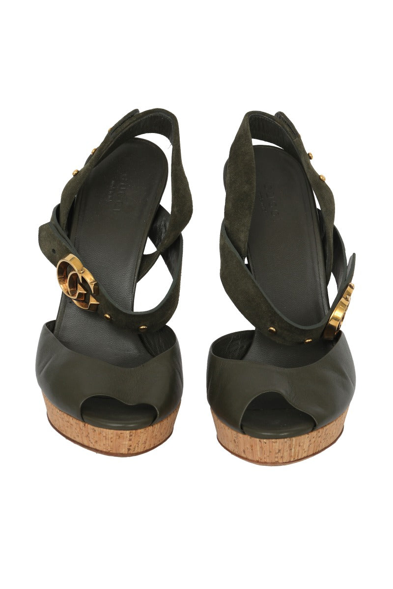 Gucci Green Leather Cork Platform Size 40 Peep Toe Heels comesin this stunning Green color. It falls under our Pristine Condition Category. No visible wear and tear or fading can be seen.