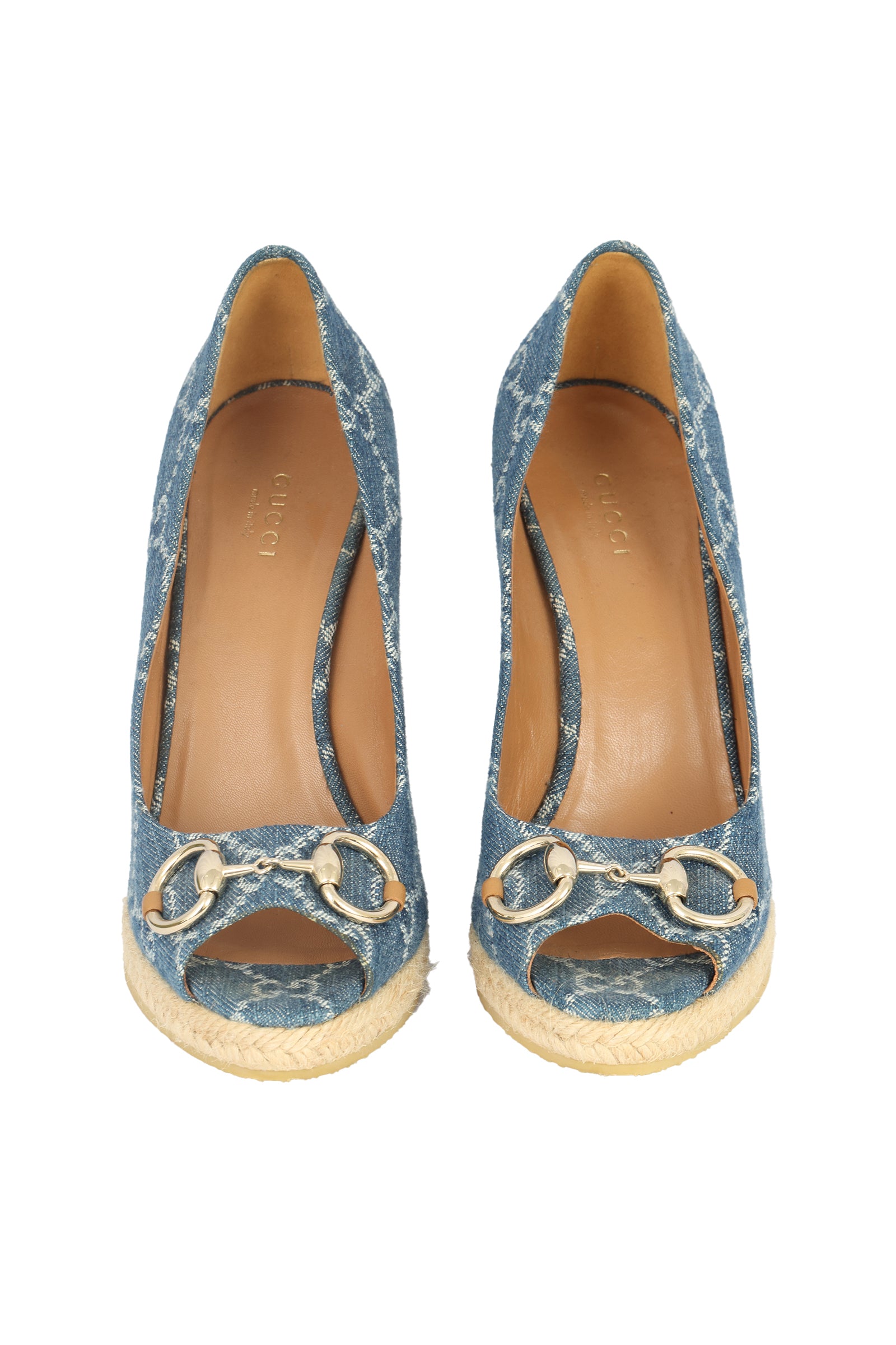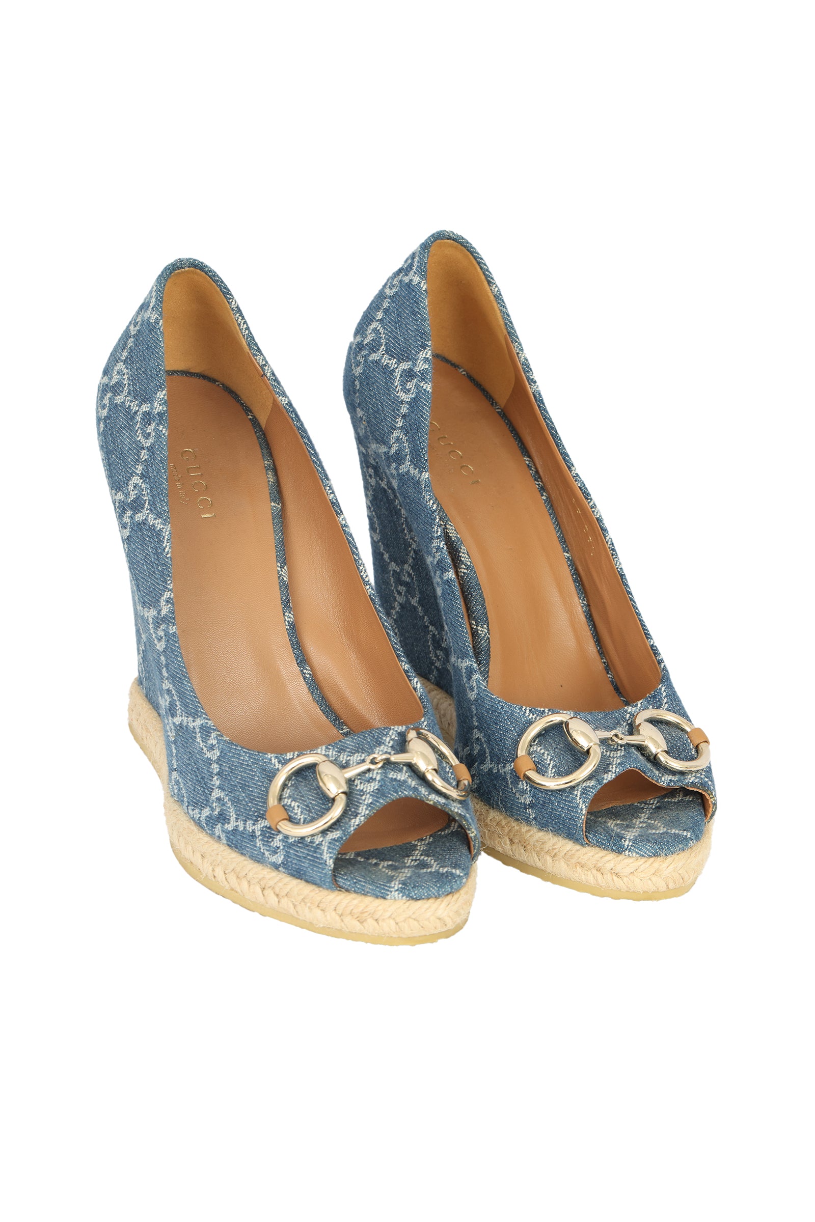 Gucci Size EU 37.5 Horsebit Monogram GG Blue Denim Wedges come in this stunning Blue colour.