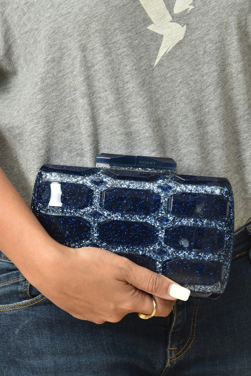 Gucci Vintage Acrylic Clutch comes in this Stunning Bluecolor .It falls under our Like New Condition Category. No visible wear and tear or fading can be seen.
