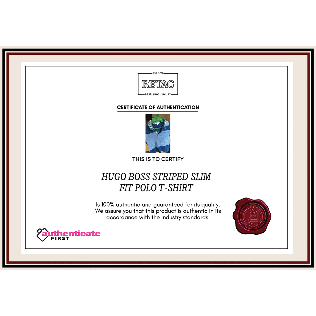 HUGO BOSS STRIPED SLIM FIT POLO T-SHIRTcomes in this Stunning Navy Blue color.It falls under our Pristinecondition category. No visible wear & tear or fading can be seen.