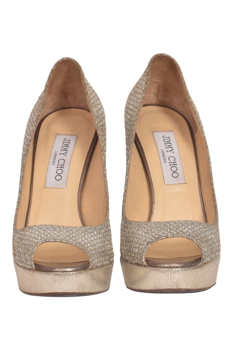 Jimmy Choo Peep Toe Pumps comes in this stunning Champagne color. It falls under our Pristine Condition Category. No visible wear and tear or fading can be seen