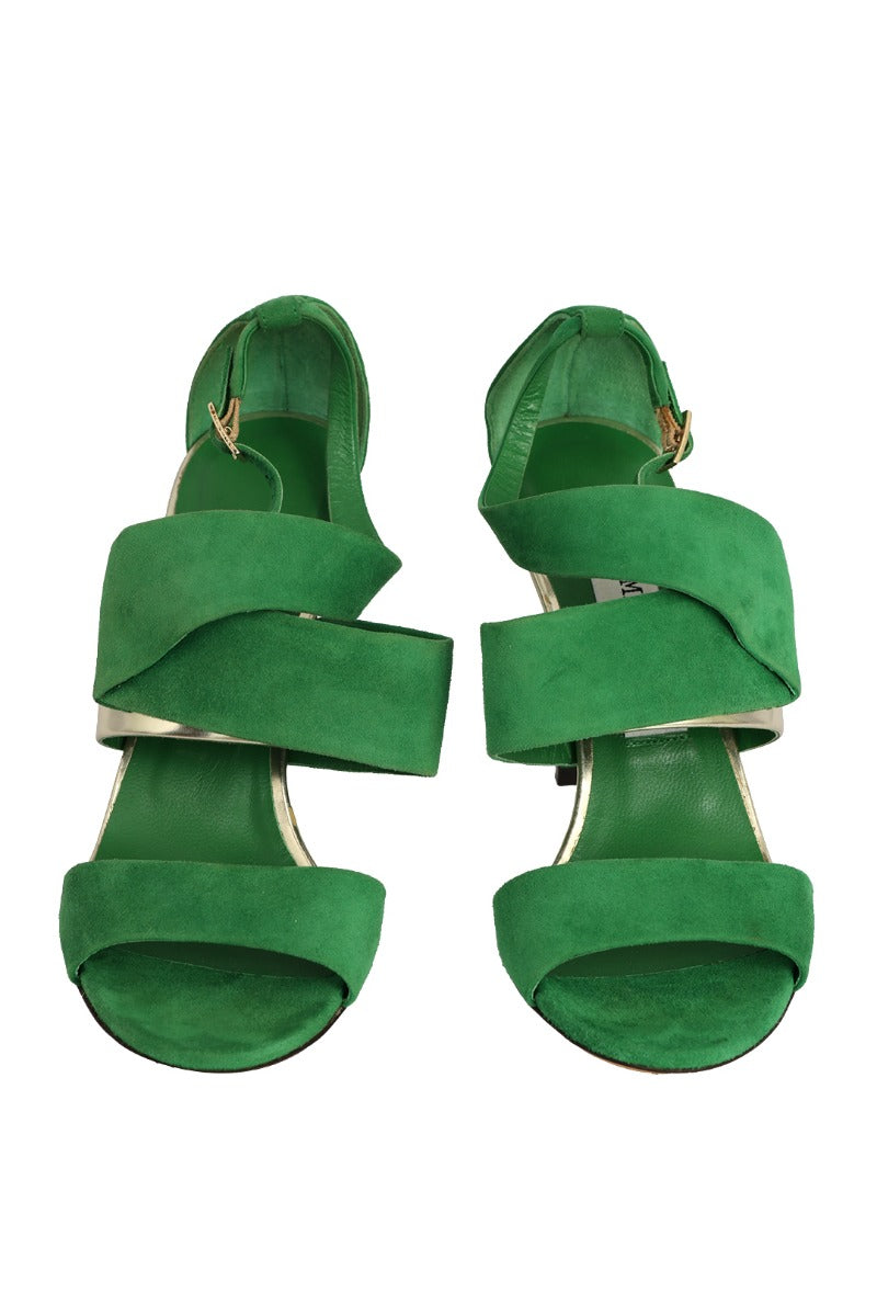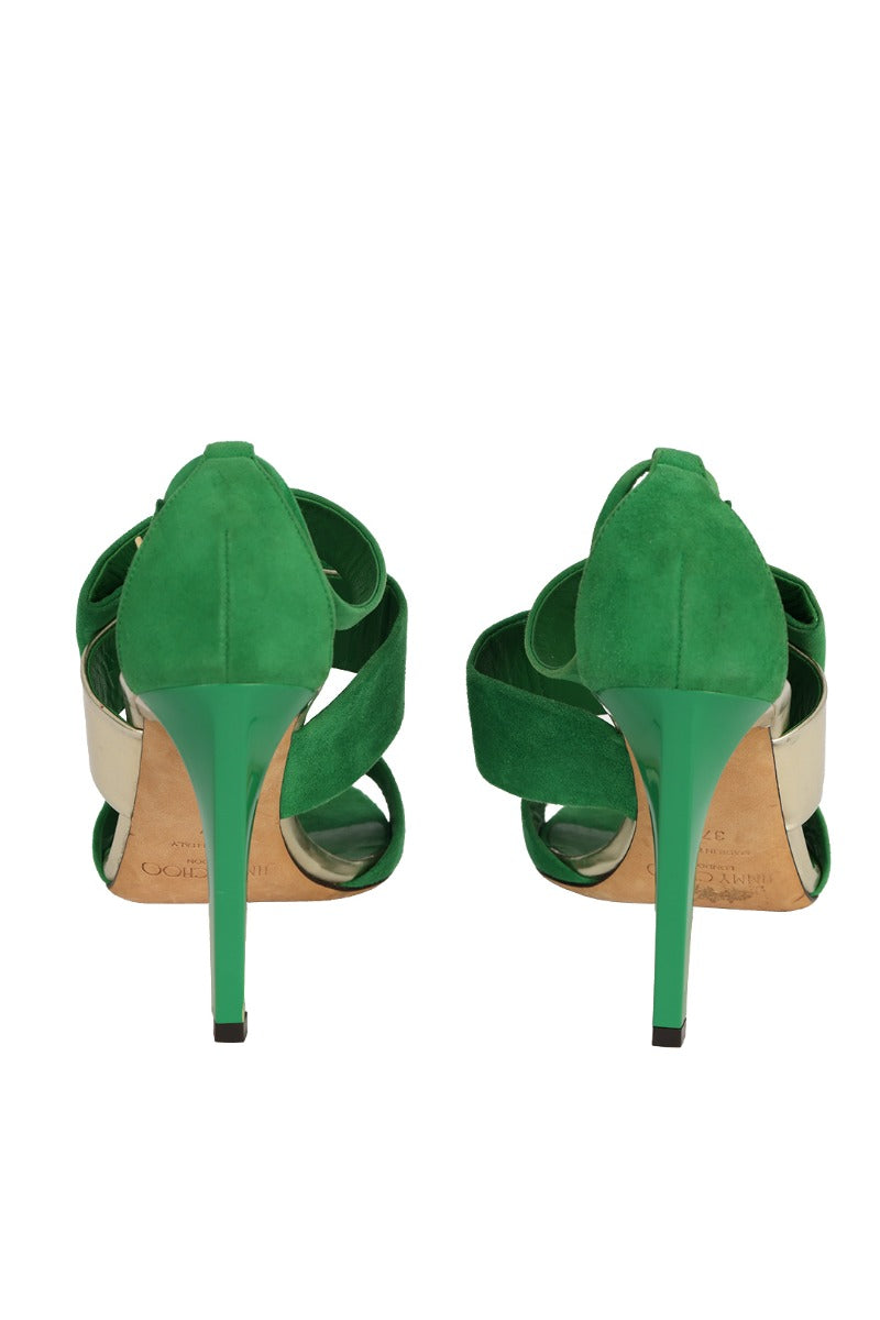 JIMMY CHOO SIZE- EU 37 GREEN SUEDE TRAPEZE ASYMMETRICAL SANDALS comes in this stunning Green color. It falls under our Pristine Condition Category. No visible wear and tear or fading can be seen.