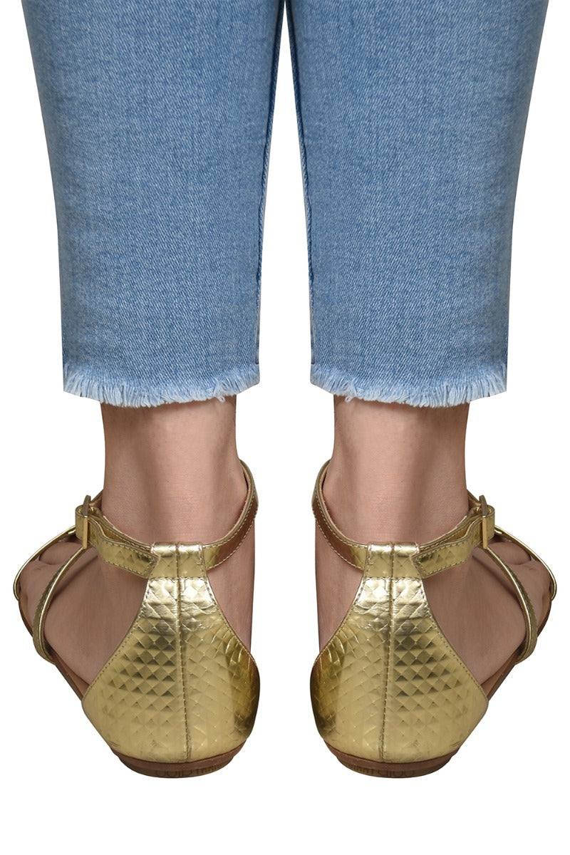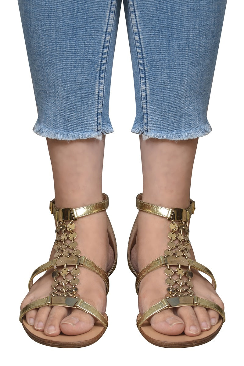 Jimmy Choo T-embellished Golden Gladiator Flats comes in this stunning Golden color. It falls under our Pristine Condition Category. No visible wear and tear or fading can be seen