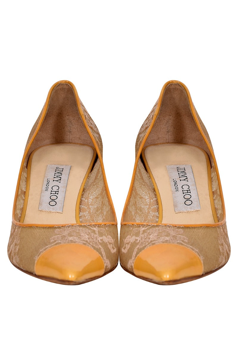 Jimmy Choo Yellow Lace Pointed Toe Heels comes in this stunning Beige color. It falls under our Pristine Condition Category. No visible wear and tear or fading can be seen