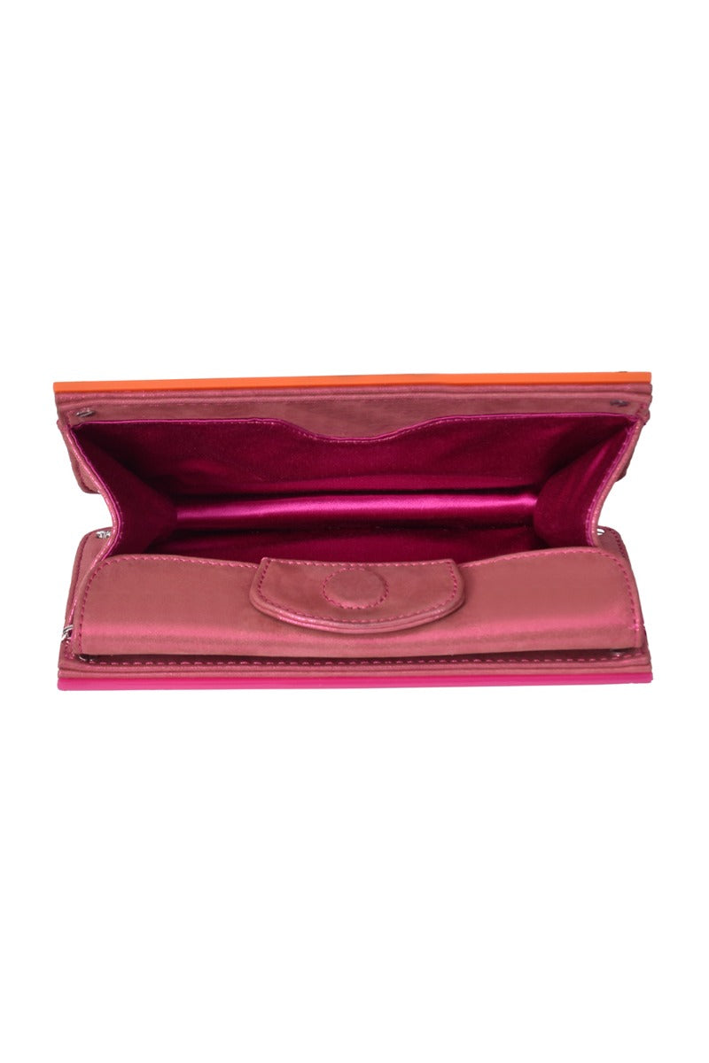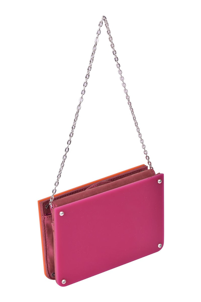 Judith LeiberBicolour Clutch Box comes in this Stunning Pink Orangecolor .It falls under our Pristine Condition Category. No visible wear and tear or fading can be seen.