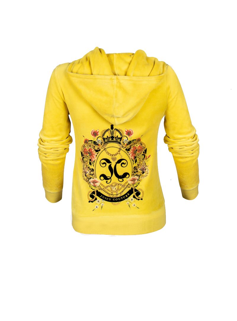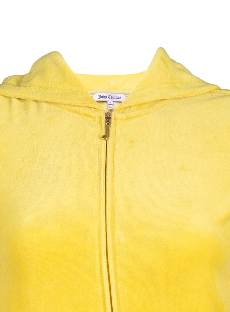 Smarten up your travel wardrobe with this must-have tracksuit jacket from the American Fashion brand, Juicy Couture. Crafted in Velour, the cotton design is adorned with front J zipper, two kangaroo pockets & a beautiful JC print on the back in black & gold. Style it up with matching yellow velour track pants or denim.