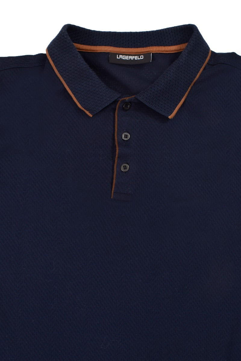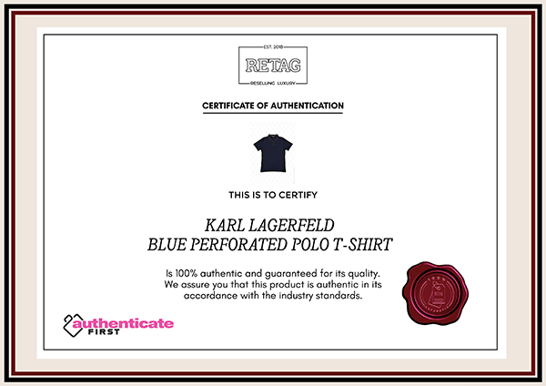 Karl Lagerfeld Blue Perforated Polo T-shirt comes in this Stunning Dark Blue color. It falls under our Pristine Condition Category. No visible wear and tear or fading can be seen.