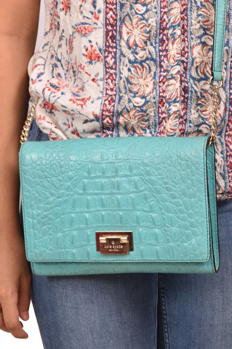 Kate Spade Orchard Valley Fiona Chic Embossed Leather Bagcomes in this Stunning Turquoise color .It falls under our Never Been Used Condition Category. No visible wear and tear or fading can be seen.