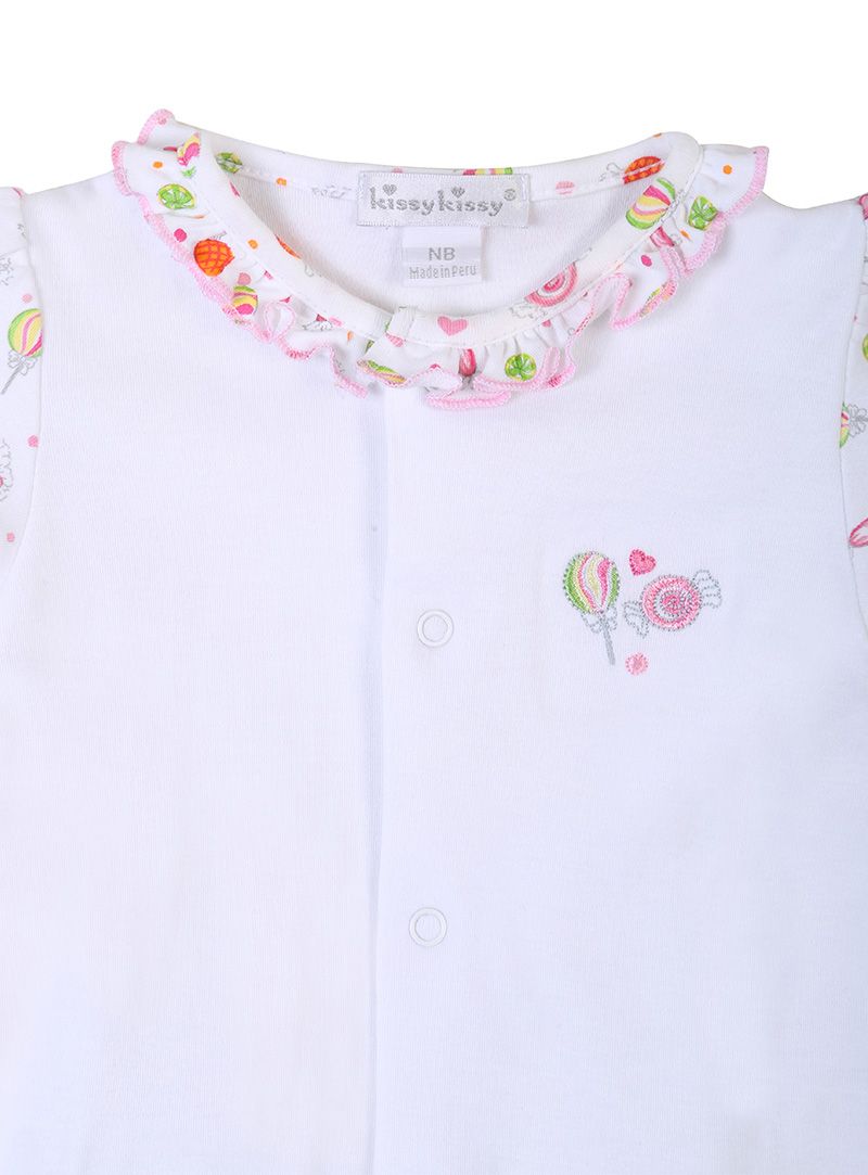 Give them a look which is out of this world with this White Candy Print & Embroidered Detail Footsie from Kissy Kissy. Fitted with press studs down the front, inbuilt mittens and ankles for a secure fit. It is adorned with an adorable Candy & lollipop print. The tiny heads are protected with an all-over printed baby hat with a turn up at the hem. Crafted from the finest Peruvian Pima cotton for a skin-soft feel that they will love to wear. COMPOSITION: