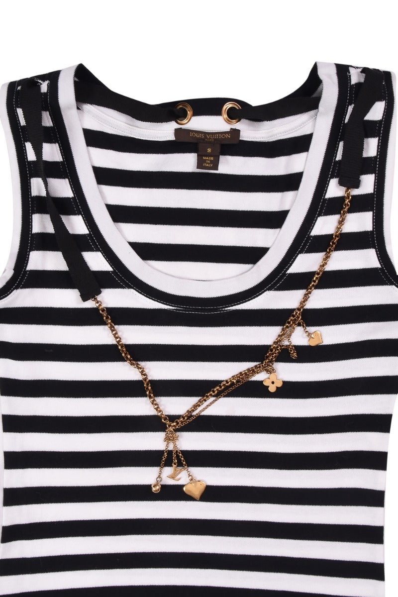 Louis Vuitton Charms Striped Sleeveless Top comes in this Stunning Black & White color. It falls under our Pristine Condition Category. No visible wear and tear or fading can be seen.