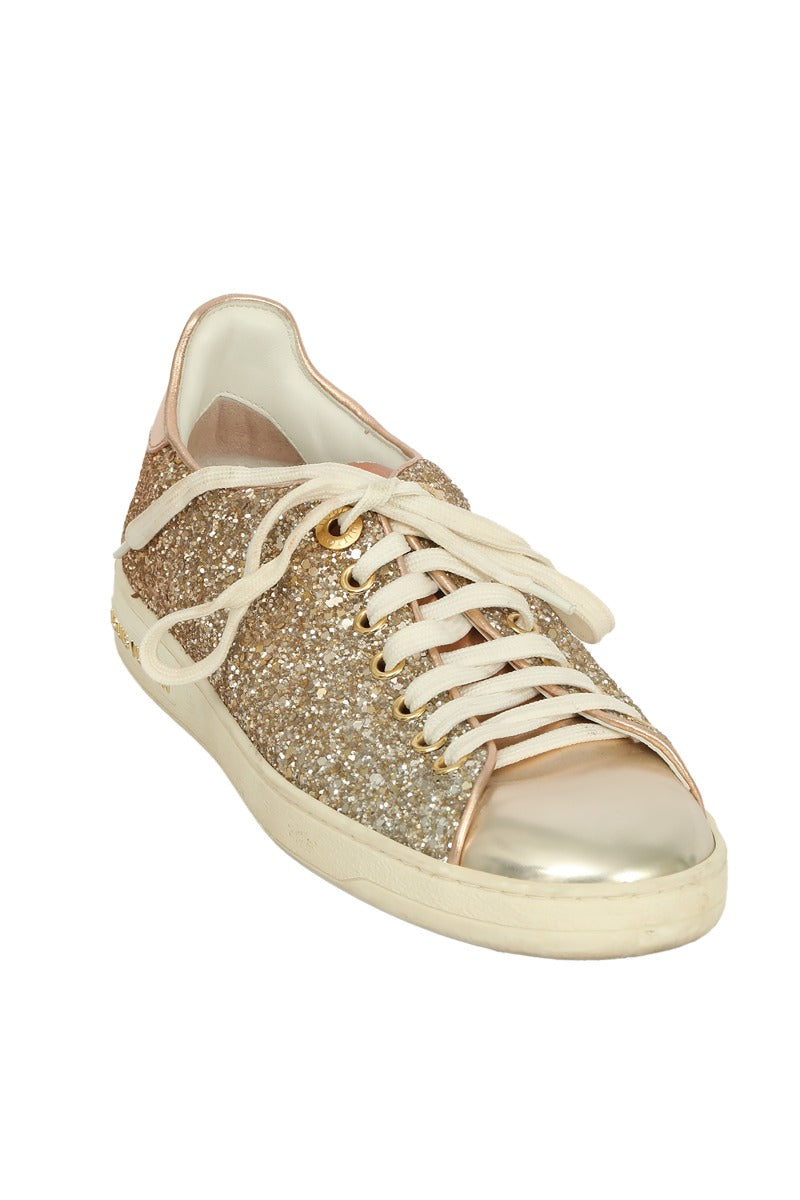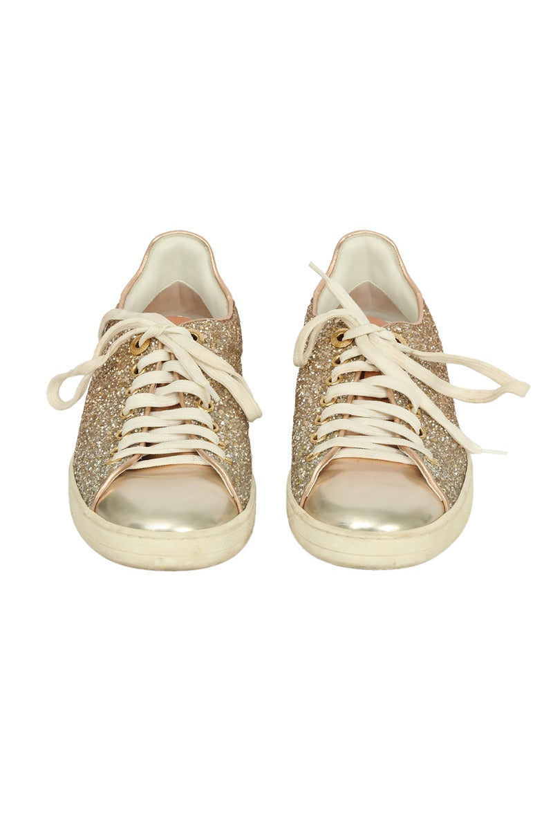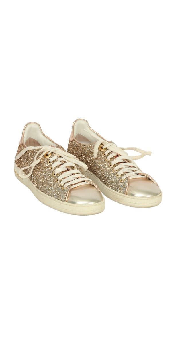Louis Vuitton EU 36 Front Low Line Glitter Sneaker in this stunning GOLDEN color. It falls under our Pristine Condition Category. No visible wear and tear or fading can be seen