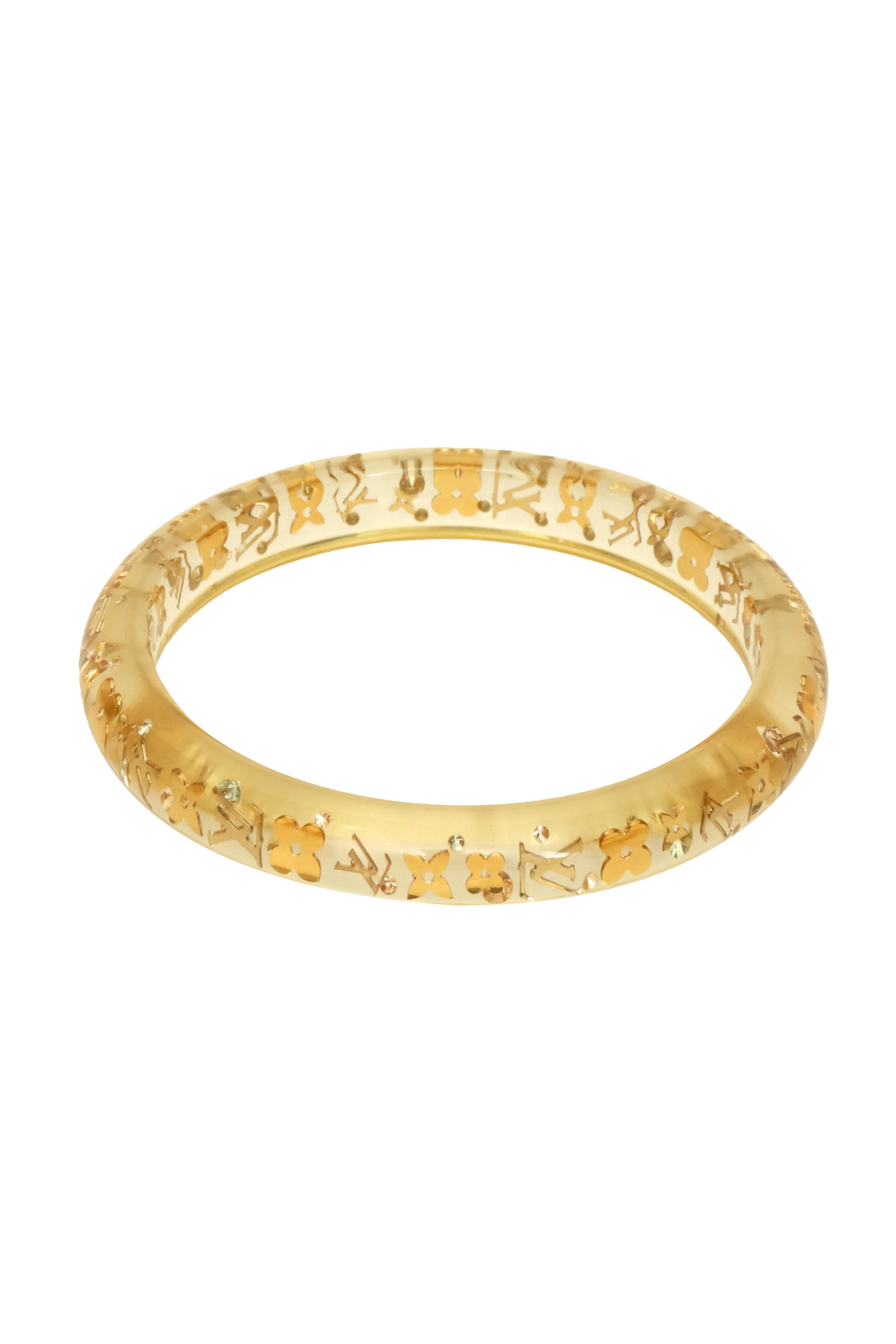 Louis Vuitton Clear Resin Gold Tone Monogram Inclusion Jonc BangleComesin this stunning Golden color. It falls under our Good Category. No visible wear and tear or fading can be seen.