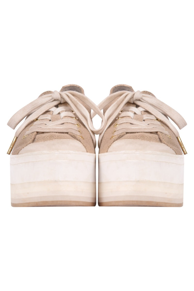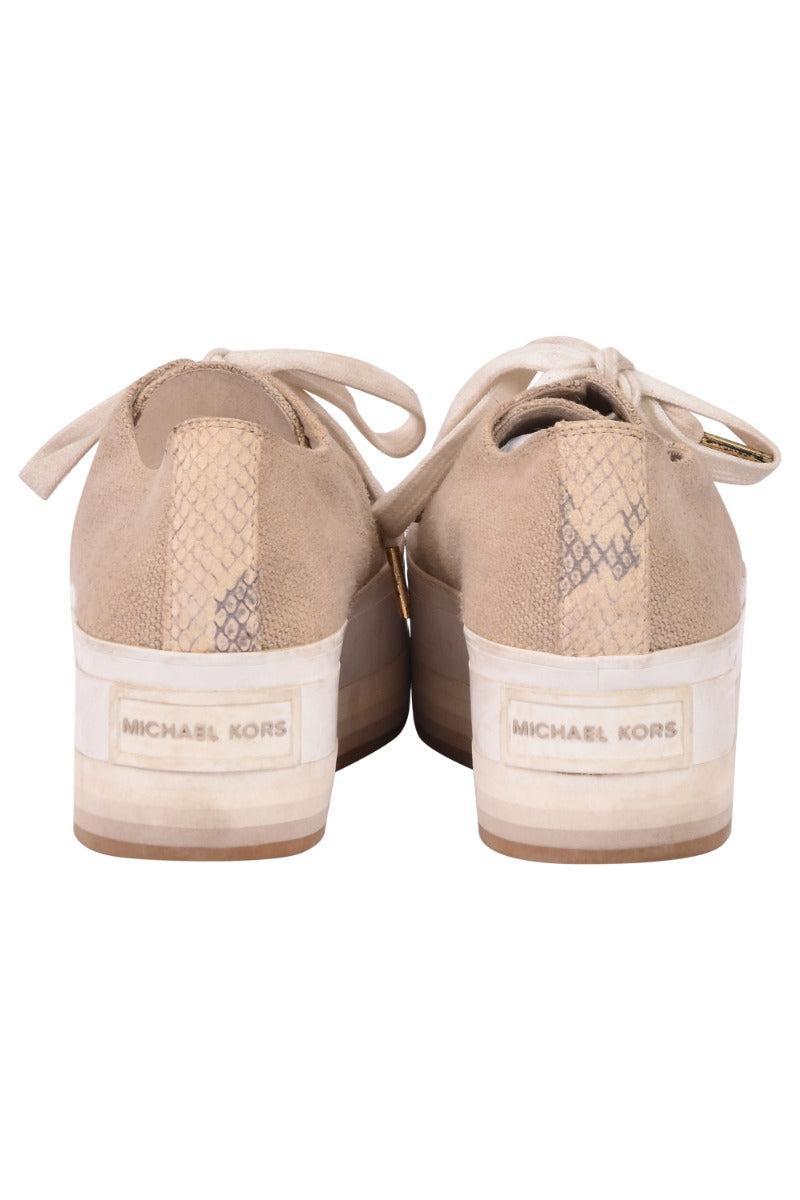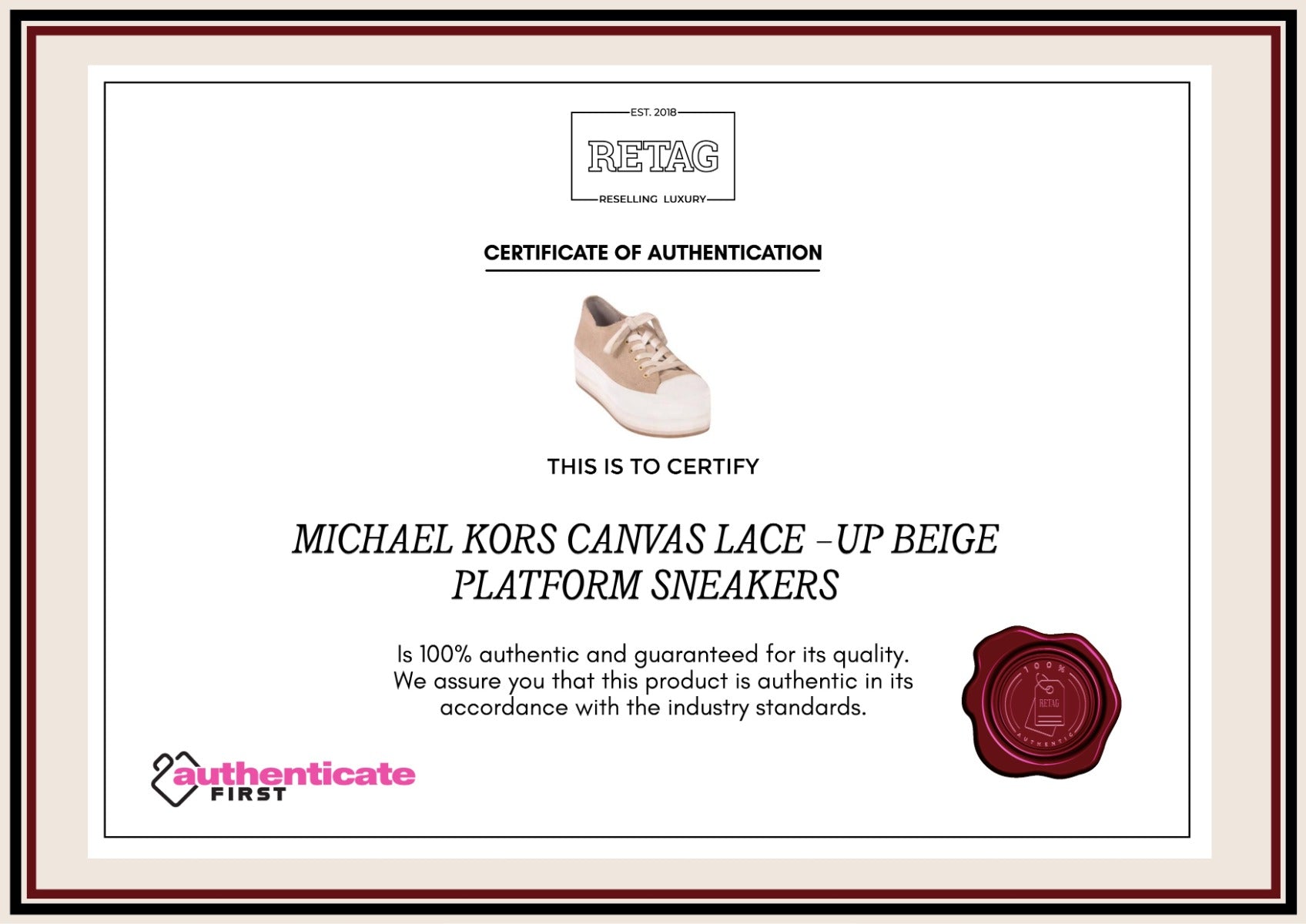 Michael Kors Canvas Lace Up Beige Platform Sneakers comes in this stunning Beige color. It falls under our Good Condition Category. No visible wear and tear or fading can be seen.