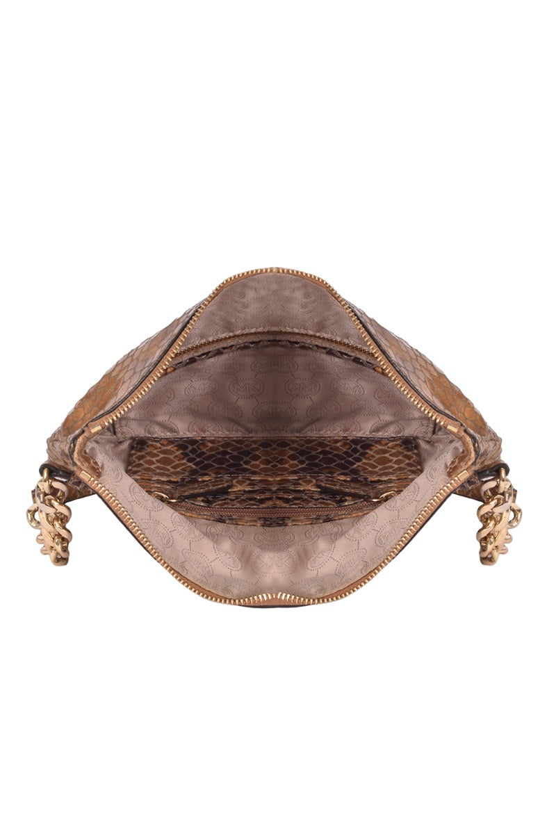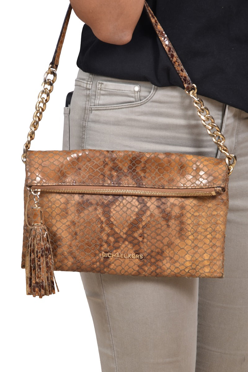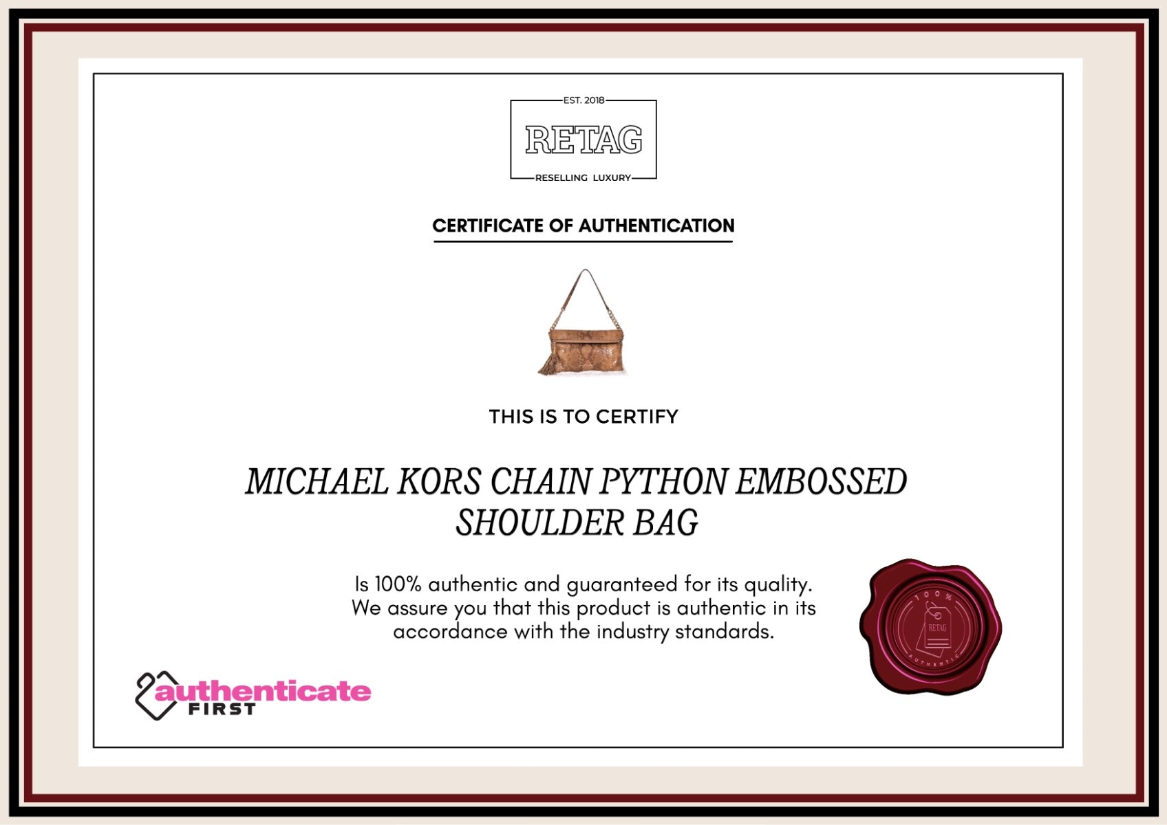 Michael Kors Chain Python Embossed Shoulder Bag comes in this Stunning Browncolor .It falls under our Pristine Condition Category. No visible wear and tear or fading can be seen.