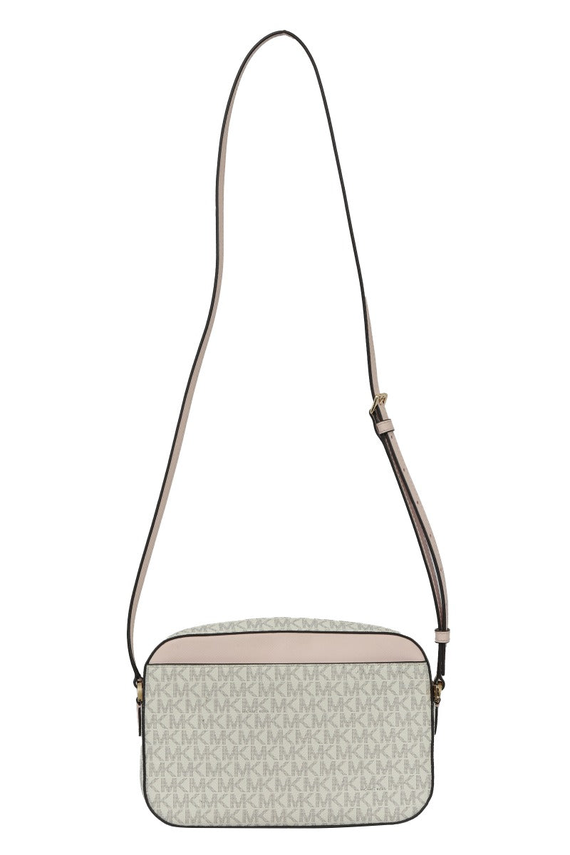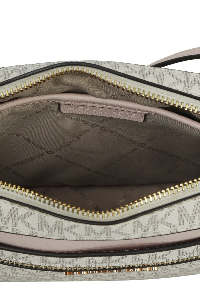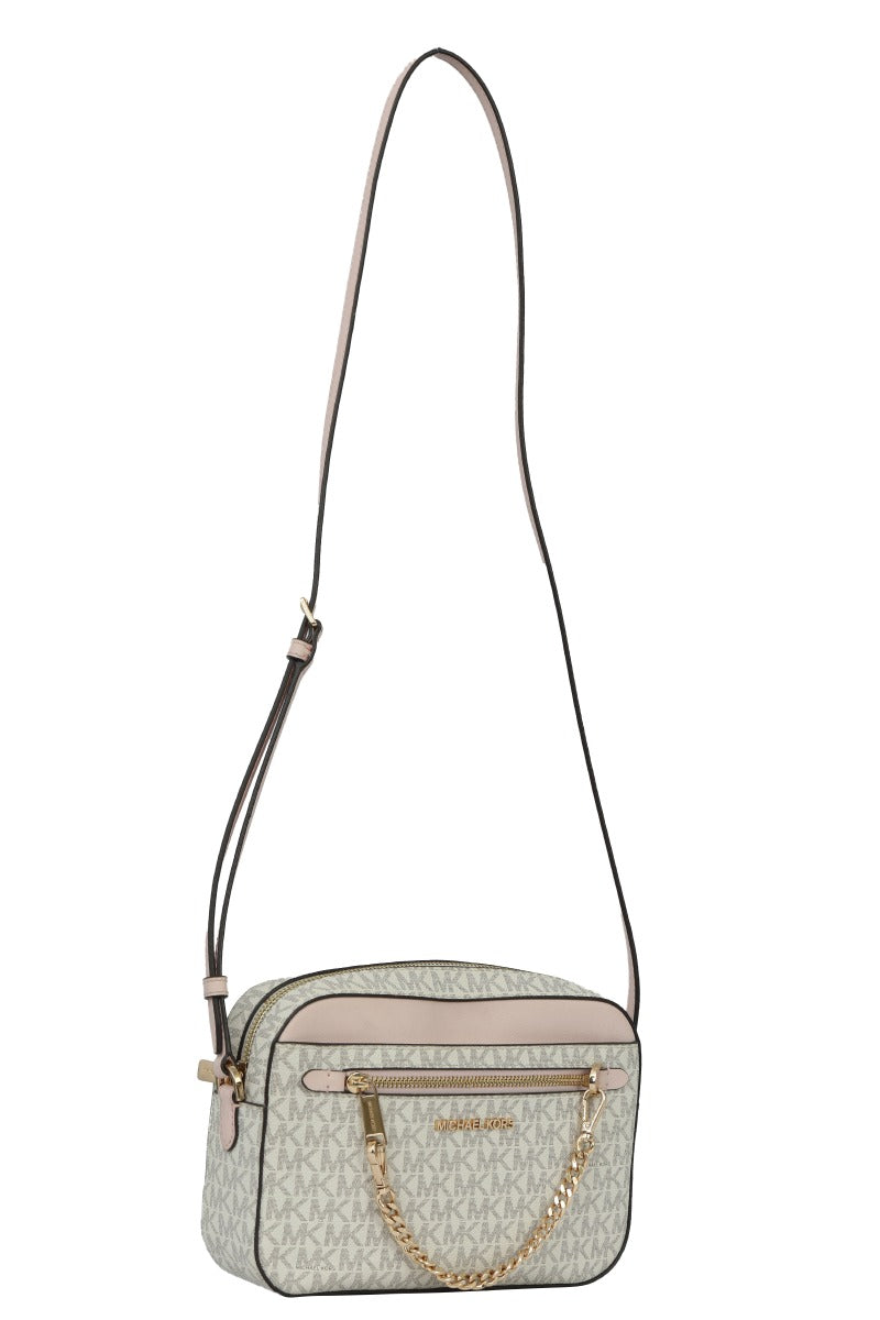 Michael Kors Jet Set East West Monogram Crossbody Bag comes in this Stunning Cream color .It falls under our Pristine Condition Category. No visible wear and tear or fading can be seen.