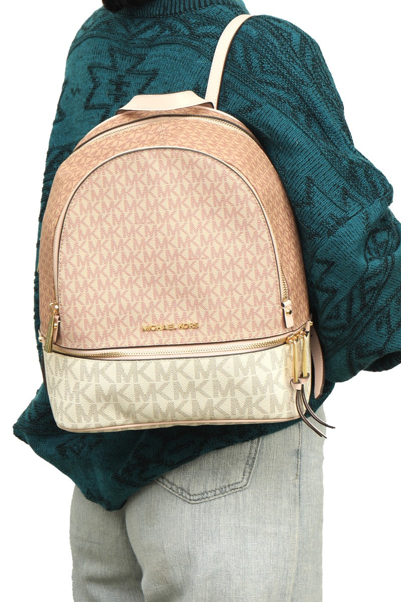 Michael Kors New Rhea Zip Up Pink/cream Monogram Backpack comes in this Stunning Pink/cream color .It falls under our LIKE NEW Condition Category. No visible wear and tear or fading can be seen.
