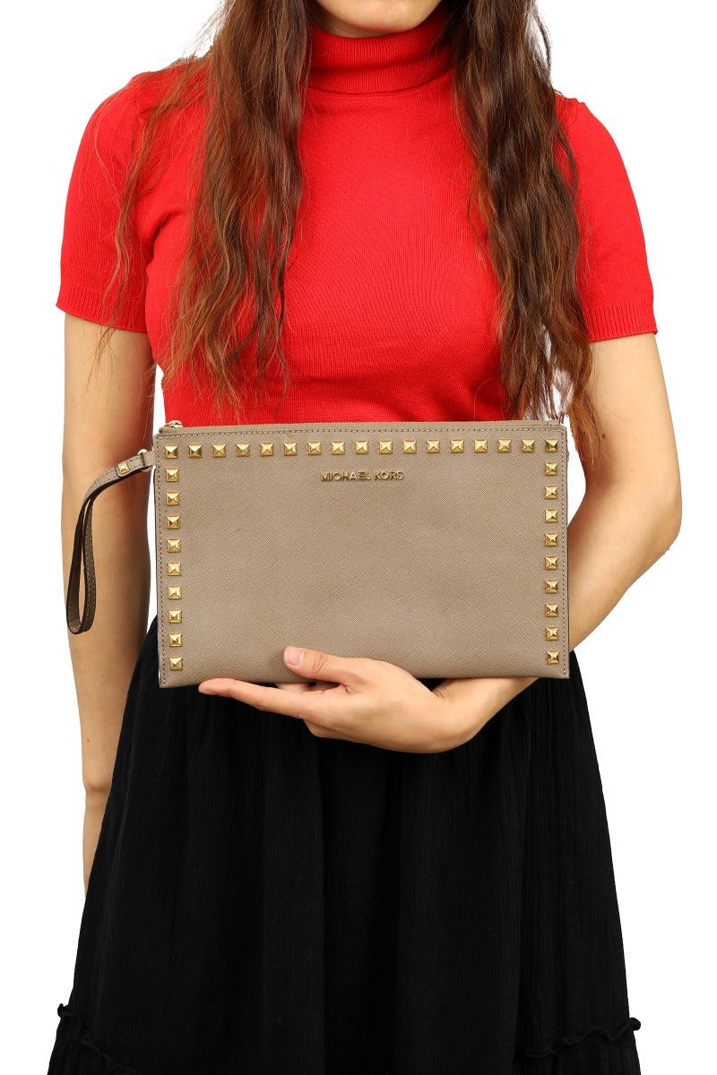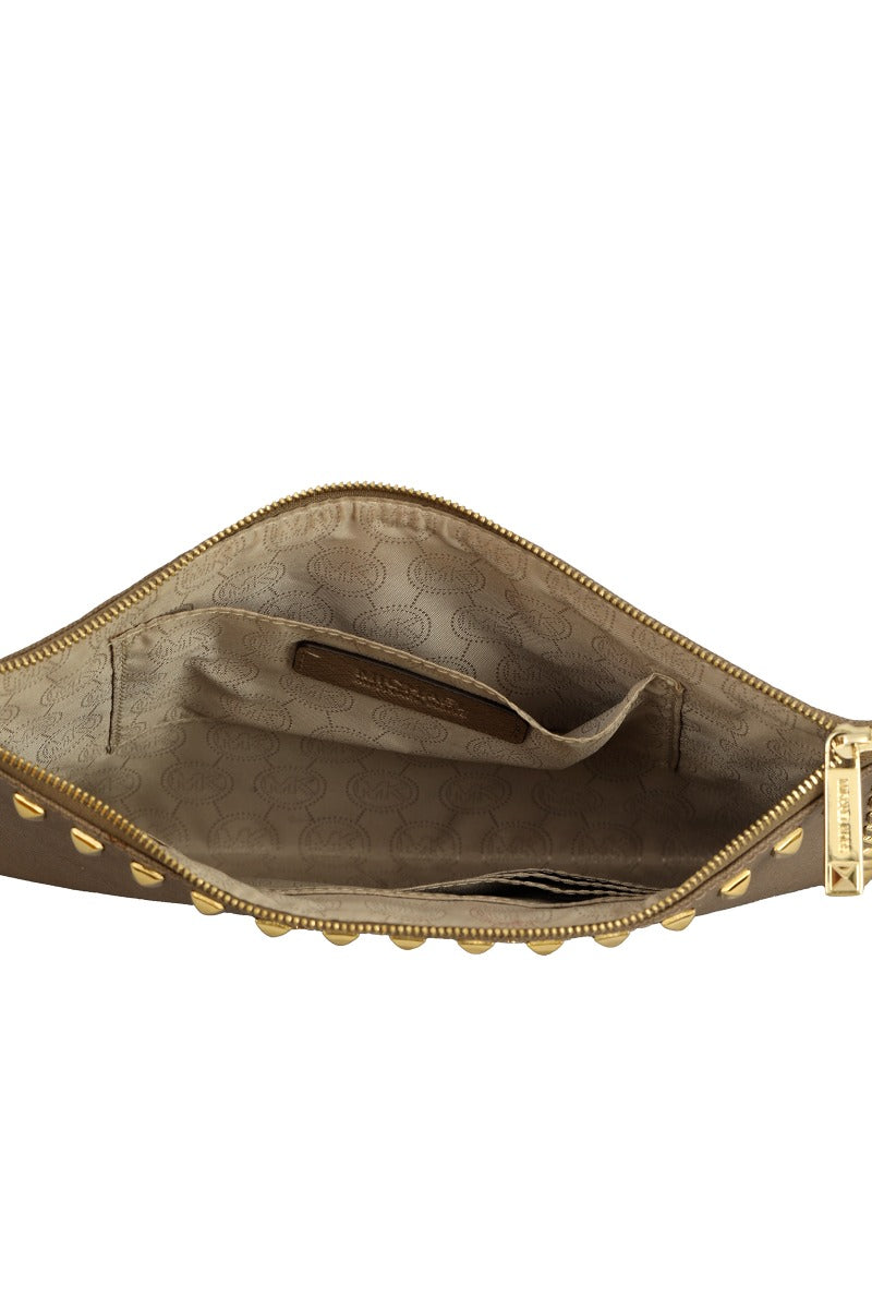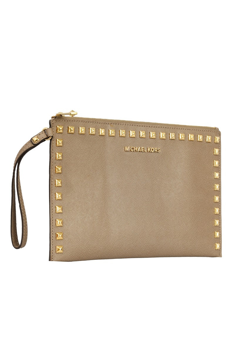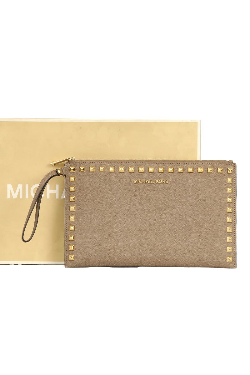 MICHAEL KORS SANDRINE STUD LEATHER ZIP WRISTLET comes in this Stunning Beige color .It falls under our Pristine Condition Category. No visible wear and tear or fading can be seen.