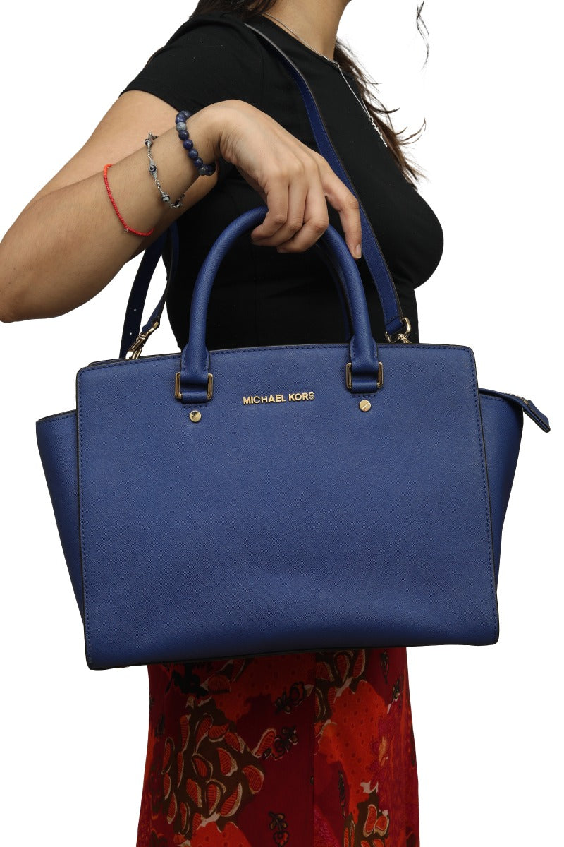 Michael Kors Selma Blue Leather Hand Bag comes in this Stunning Bluecolor .It falls under our Pristine Condition Category. No visible wear and tear or fading can be seen