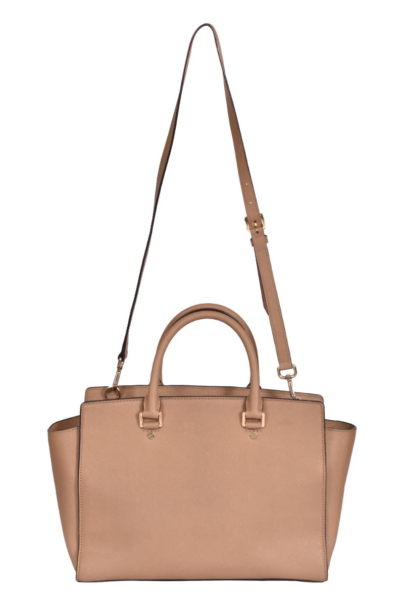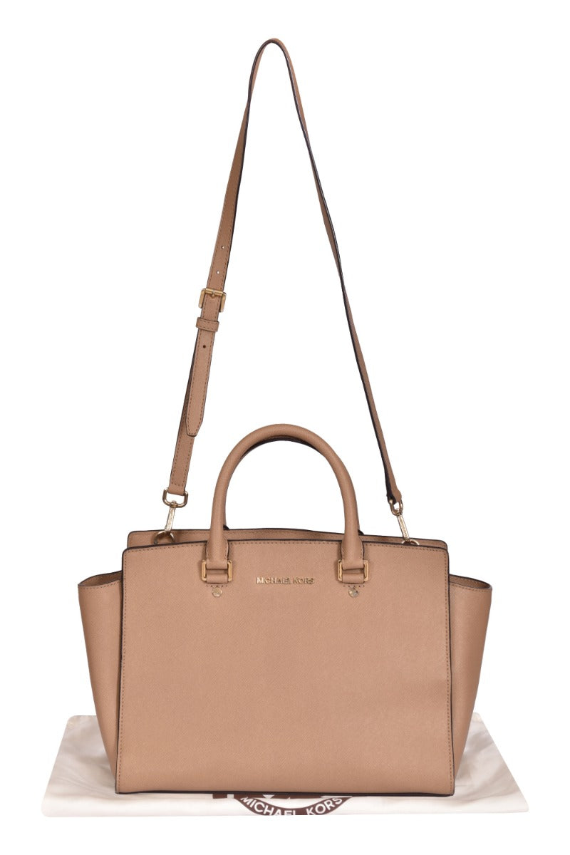 Michael Kors Selma Medium Top Zip Satchel Crossbody Bag comes in this Stunning Beige color .It falls under our Pristine Condition Category. No visible wear and tear or fading can be seen.