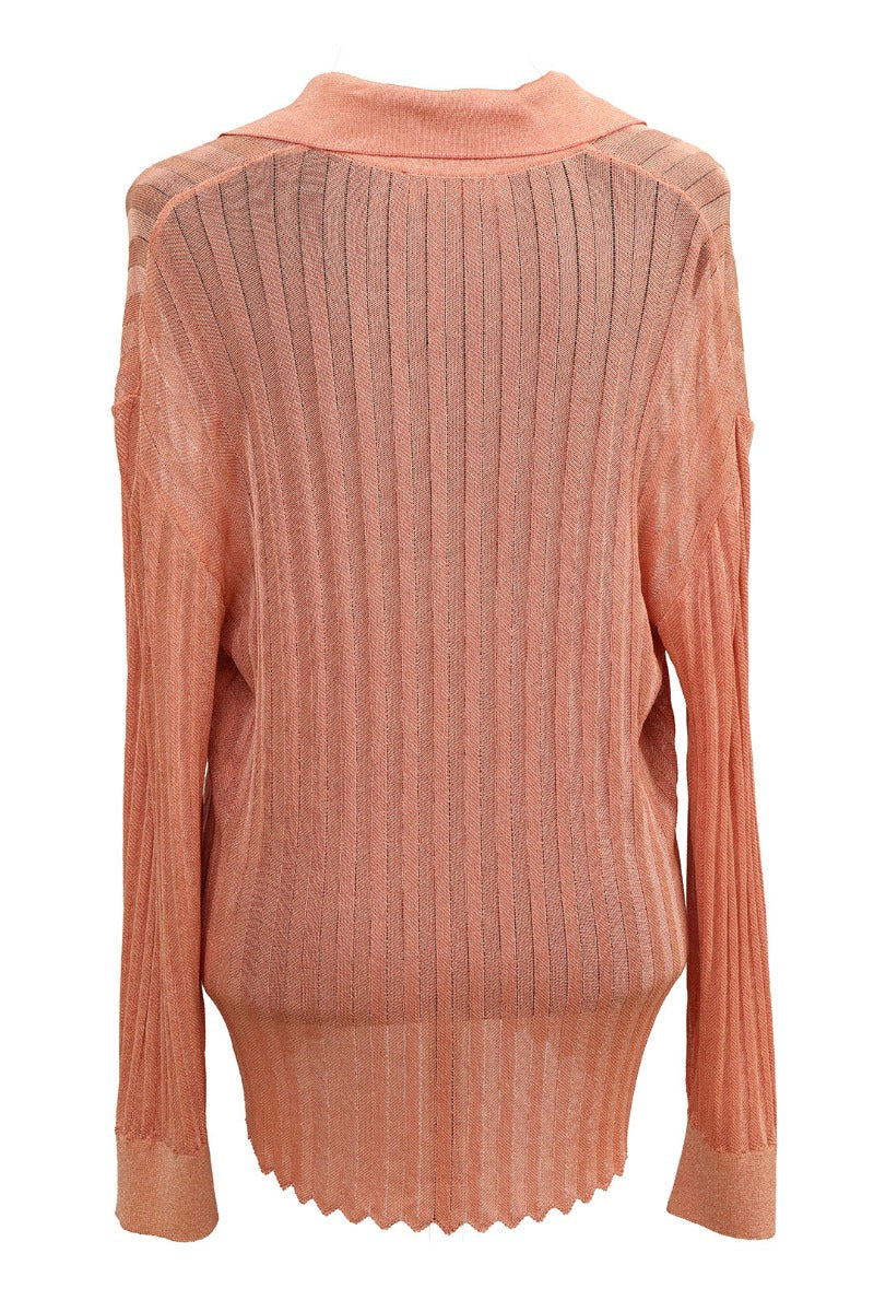 MISSONI SIZE- 40/L PINK SHEER RIB KNIT V NECK LONG SLEEVE TOP comes in this Stunning Peach color. It falls under our Pristine Condition Category. No visible wear and tear or fading can be seen.