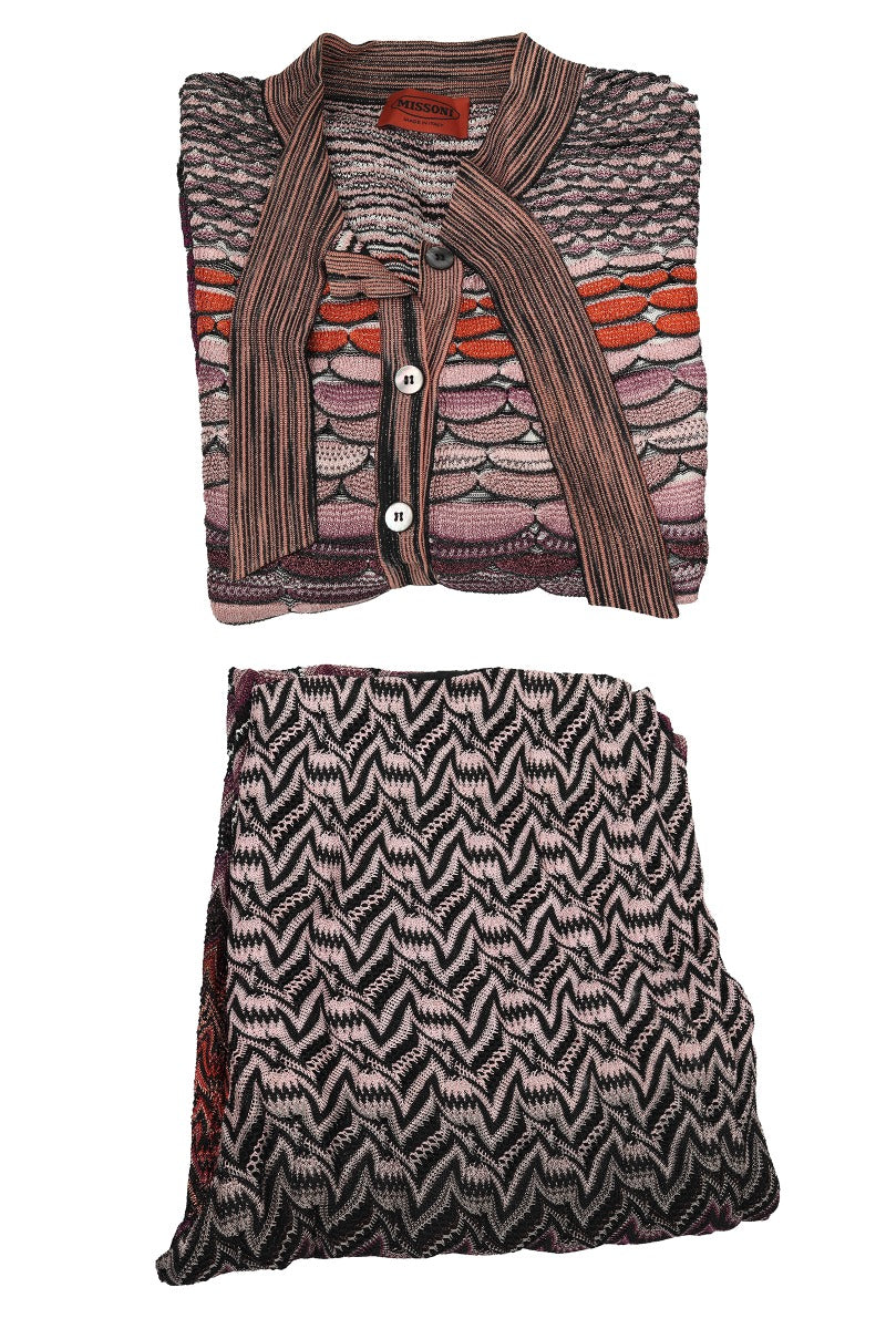 MISSONI SIZE 42 PINK CHEVRON PATTERN CARDIGAN SUIT comes in this Stunning Pink color. It falls under our Pristine Condition Category. No visible wear and tear or fading can be seen.