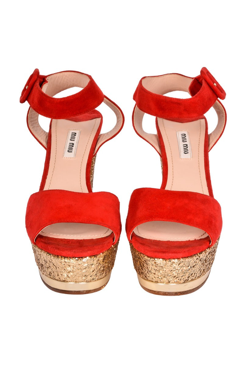 MIU MIU RED GLITTER SUEDE PEEPTOES comes in this stunning Red color. It falls under our Like New Condition Category. No visible wear and tear or fading can be seen